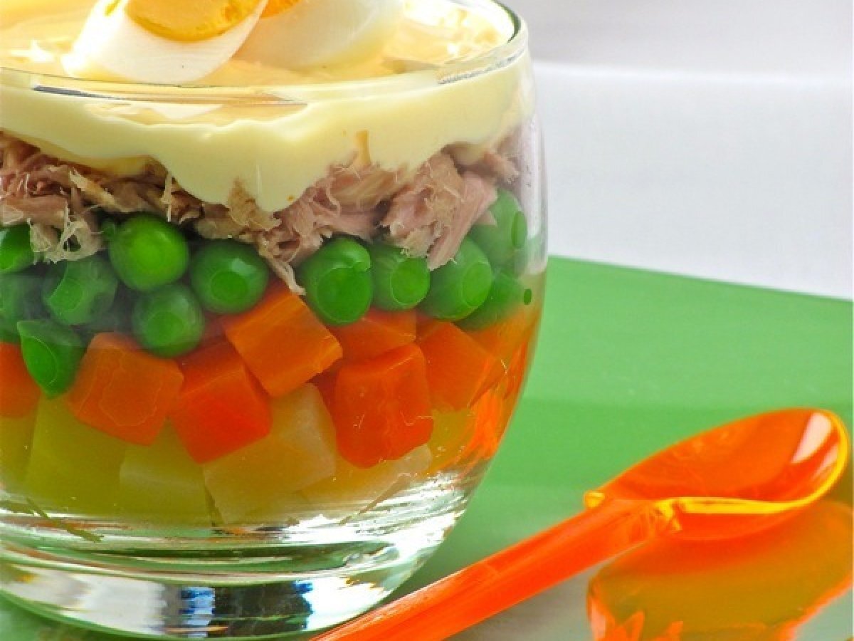 Bicchierino di insalata russa PrecedenteProssimo Antipastofacile50 min430 Kcal Invia questa ricetta ad un amico Stampa la ricetta Contatta l'autore della Ricetta Pubblica la foto di questa ricetta Un'idea che piacerà sicuramente ai vostri ospiti! Ingredienti 4 * 3 carote * 3 patate * 200 gr. di piselli * 160 gr. di tonno sott'olio * 100 gr. di maionese * 2 uova di quaglia