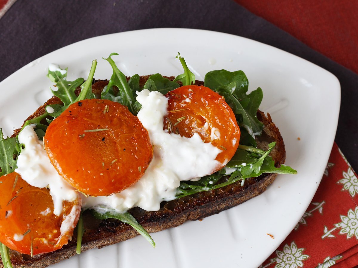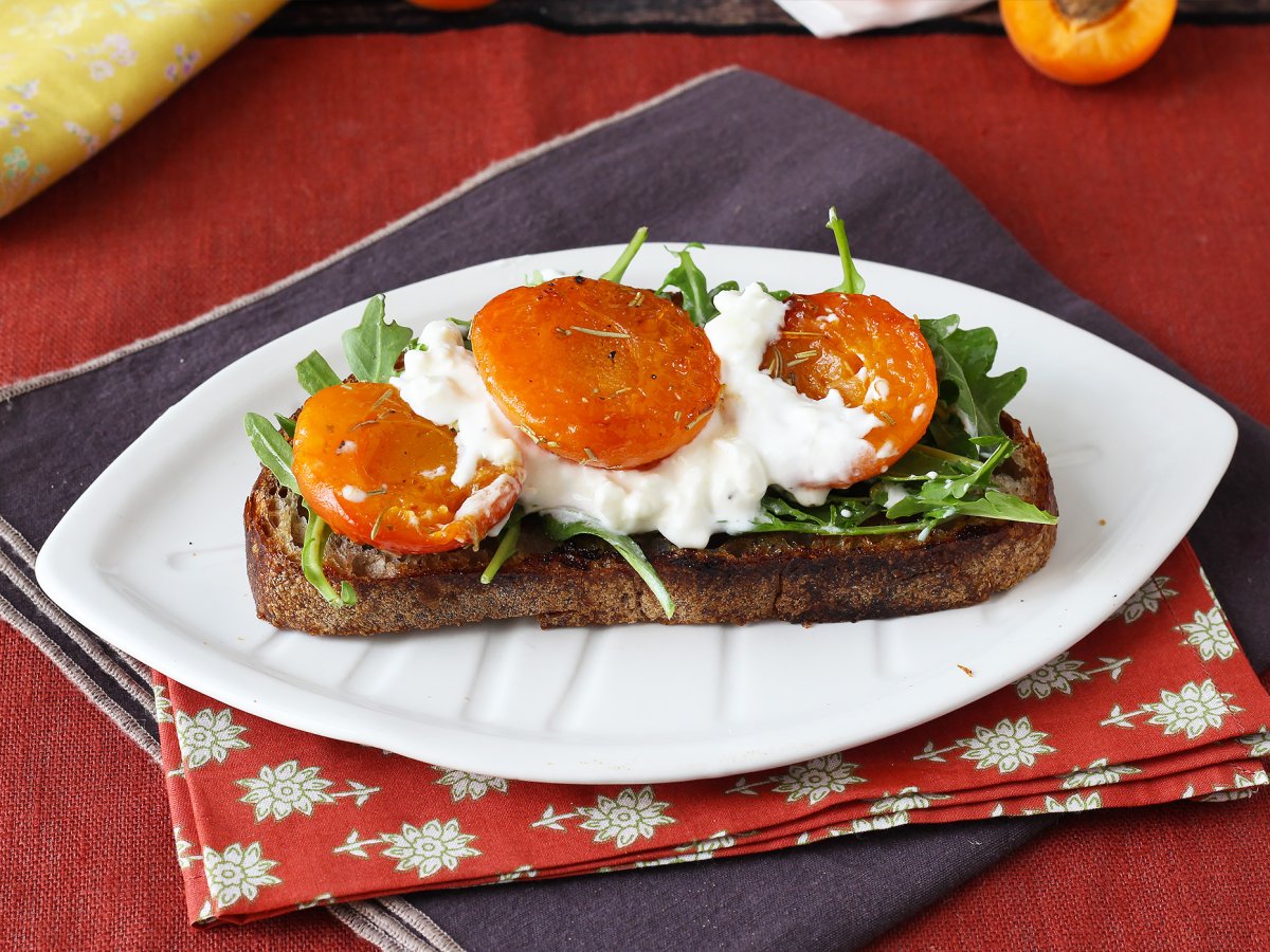 Bruschetta estiva con albicocche arrostite, rucola e burrata