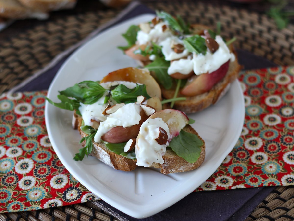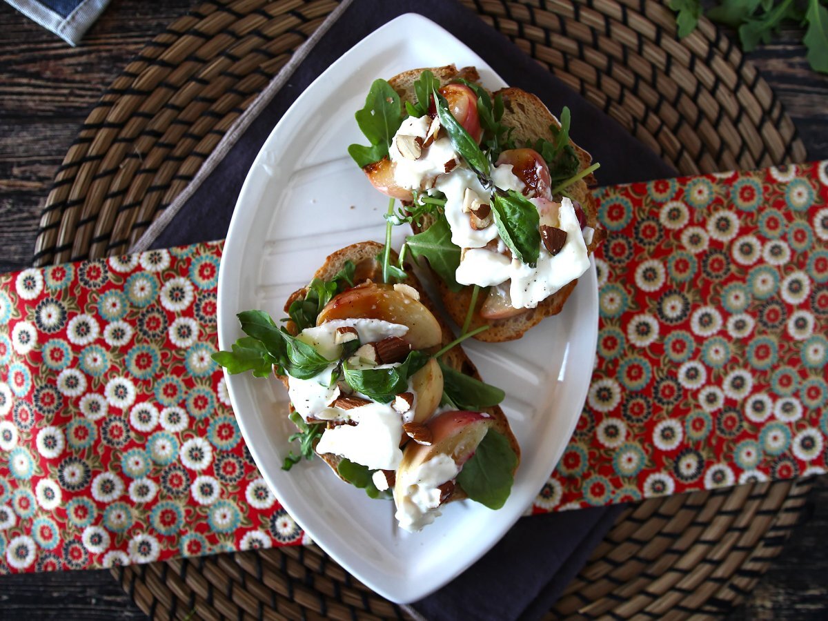 Bruschette con burrata, pesche grigliate e rucola: l'idea agrodolce che stupirà tutti!