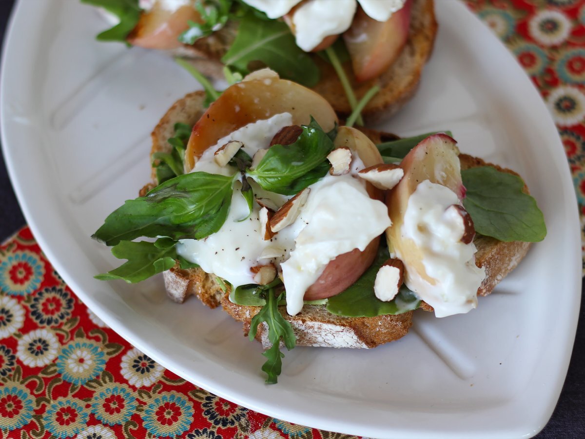 - Ora adagiate un po' di rucola sul pane abbrustolito, poi aggiungete le pesche grigliate. Condite con un filo d'olio, del sale e del pepe.