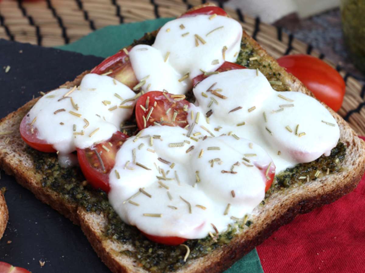 Ieri sere avevamo un leggero languorino, una grande voglia di qualcosa di gustoso e facile da preparare. Ecco cosa ci siamo inventati: un crostino all'italiana realizzata con pesto, pomodorini e mozzarella. Seguite i nostri consigli e provatela anche voi!