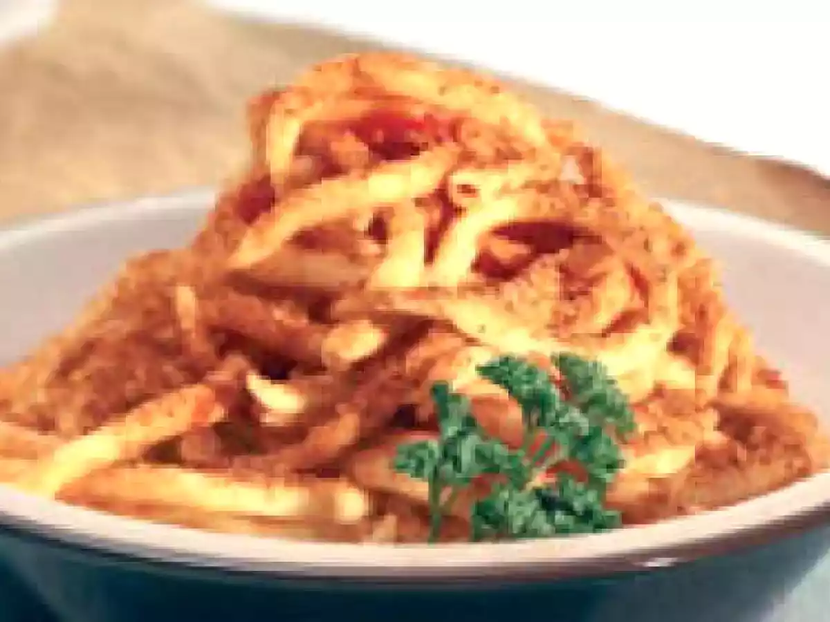 Scolate la pasta al dente, trasferitela in zuppiera calda, conditela con il sugo di pomodoro poi cospargetela con metà del pangrattato e mesolate bene.