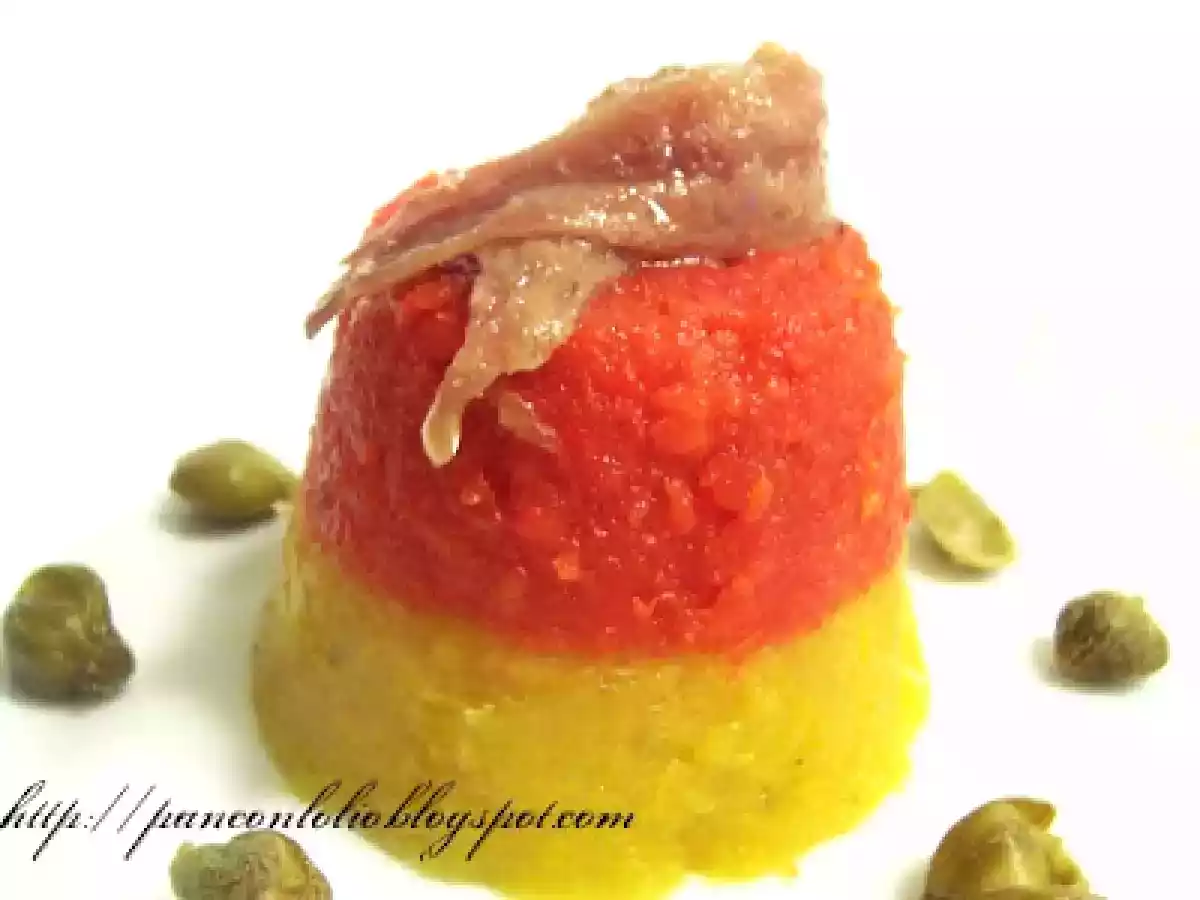 Budini light di peperoni vota adesso PrecedenteProssimo Antipastofacile20 min Invia questa ricetta ad un amico Stampa la ricetta Contatta l'autore della Ricetta Pubblica la foto di questa ricetta Molto bello da vedere e mangiare. Ingredienti 4 200 g di peperone rosso 200 g di peperone giallo gelatina in fogli 6 g sale origano Per decorare (facoltativo) Capperi acciughe