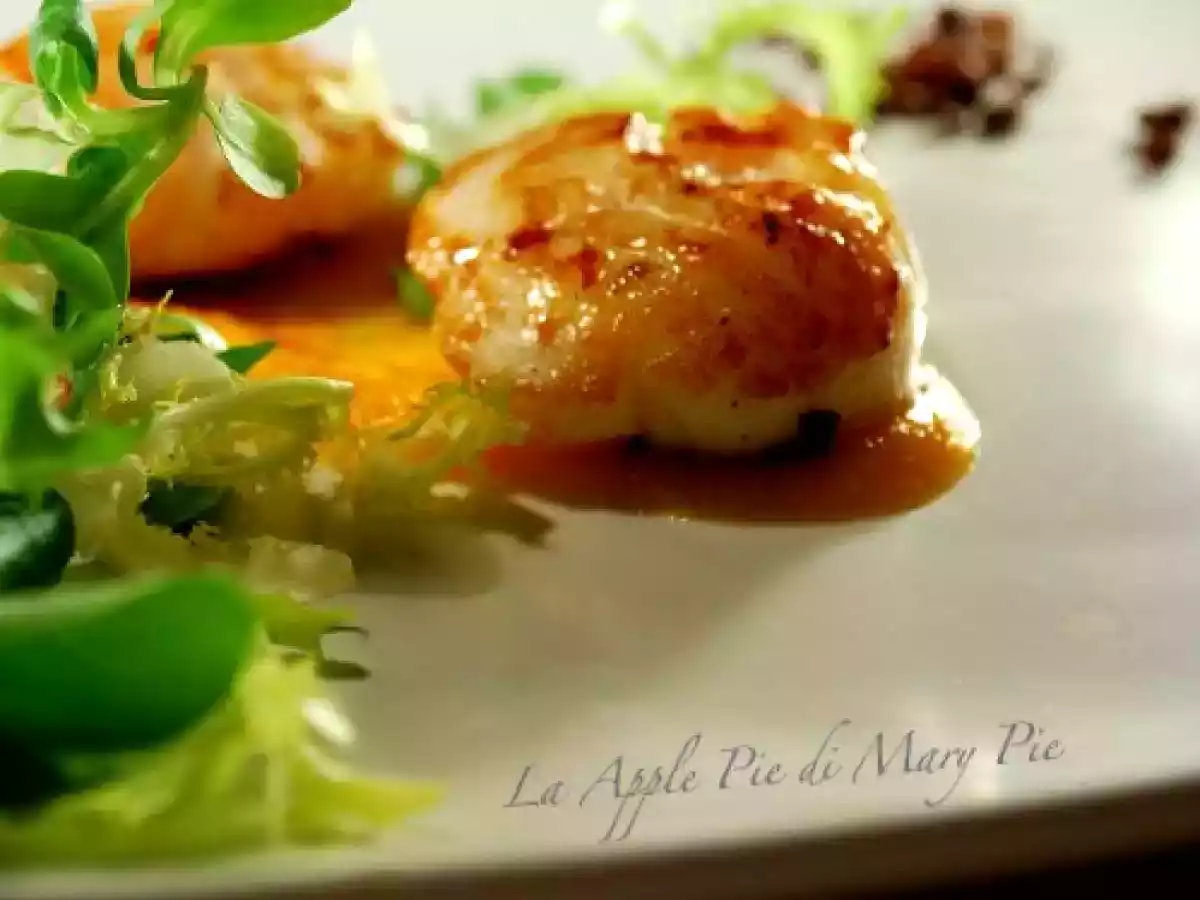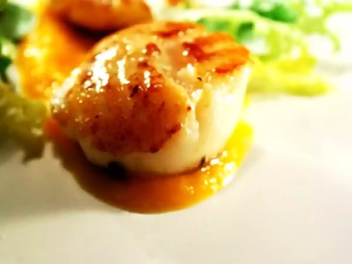 Capesante al curry PrecedenteProssimo Antipastofacile35 min Invia questa ricetta ad un amico Stampa la ricetta Contatta l'autore della Ricetta Pubblica la foto di questa ricetta Una ricetta davvero speciale per gustare le capesante Ingredienti 4 8 noci di capesante 1/2 cipolla bianca 1-2 carote 1 rametto achillea aromatica 1/2 peperone giallo 1/2 sedano rapa piccolo 30 ml aceto di champagne 70 ml olio extravergine di oliva curry in polvere sale in scaglie pepe aromatico (io ho usato quello di Zhichuan) 100 g germogli di cipolla (non li ho trovati, e neppure quelli di soia; ho sostituito con una misticanza di fresche insalatine)