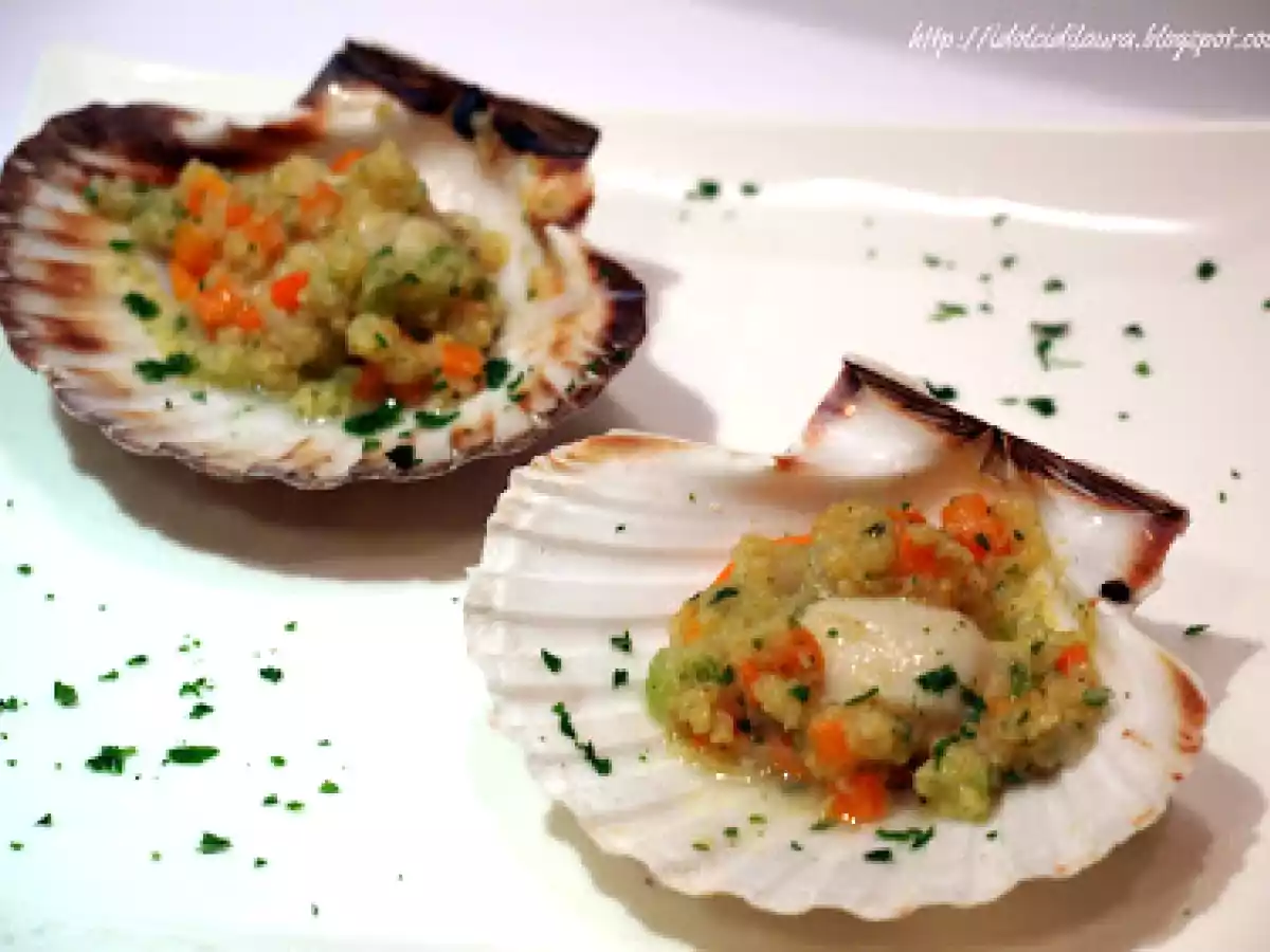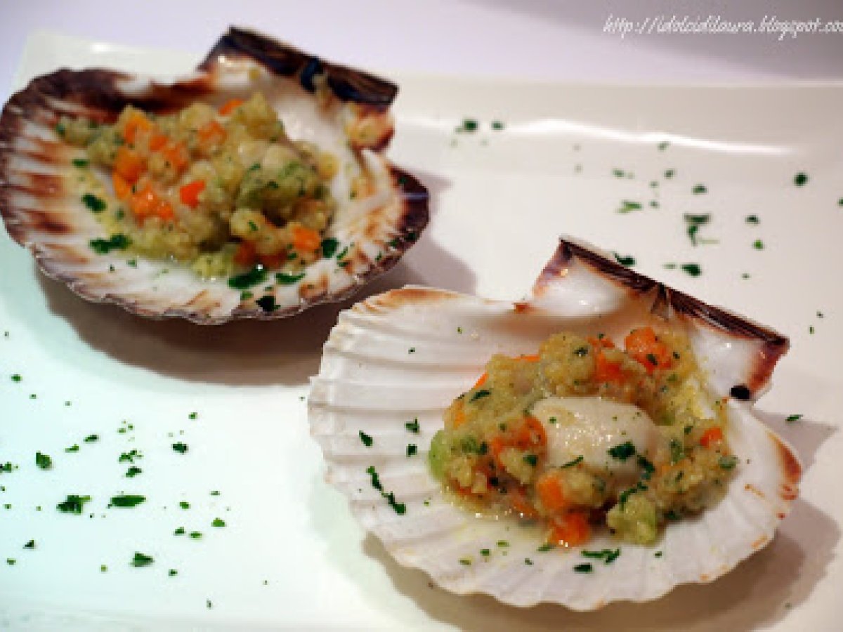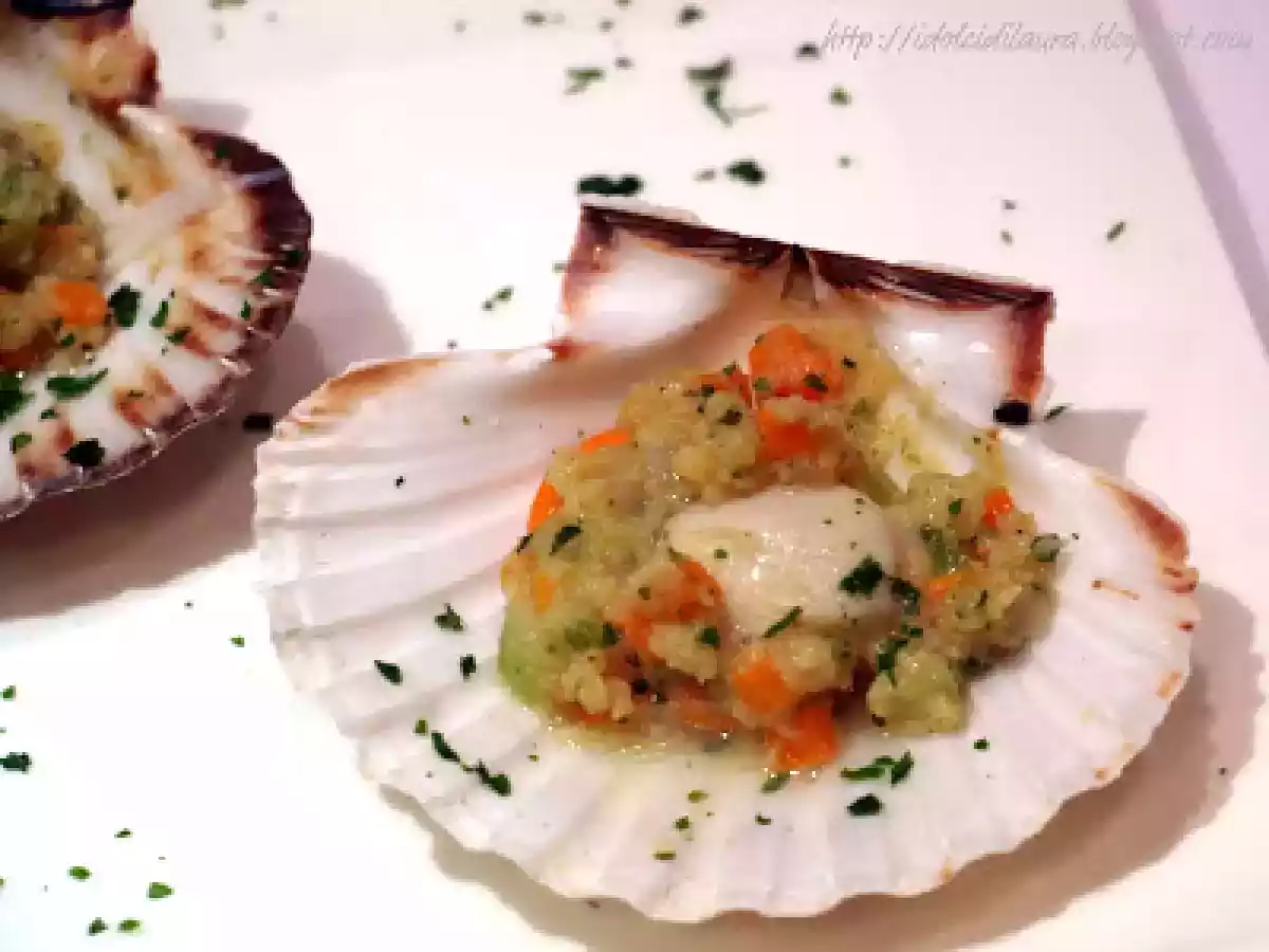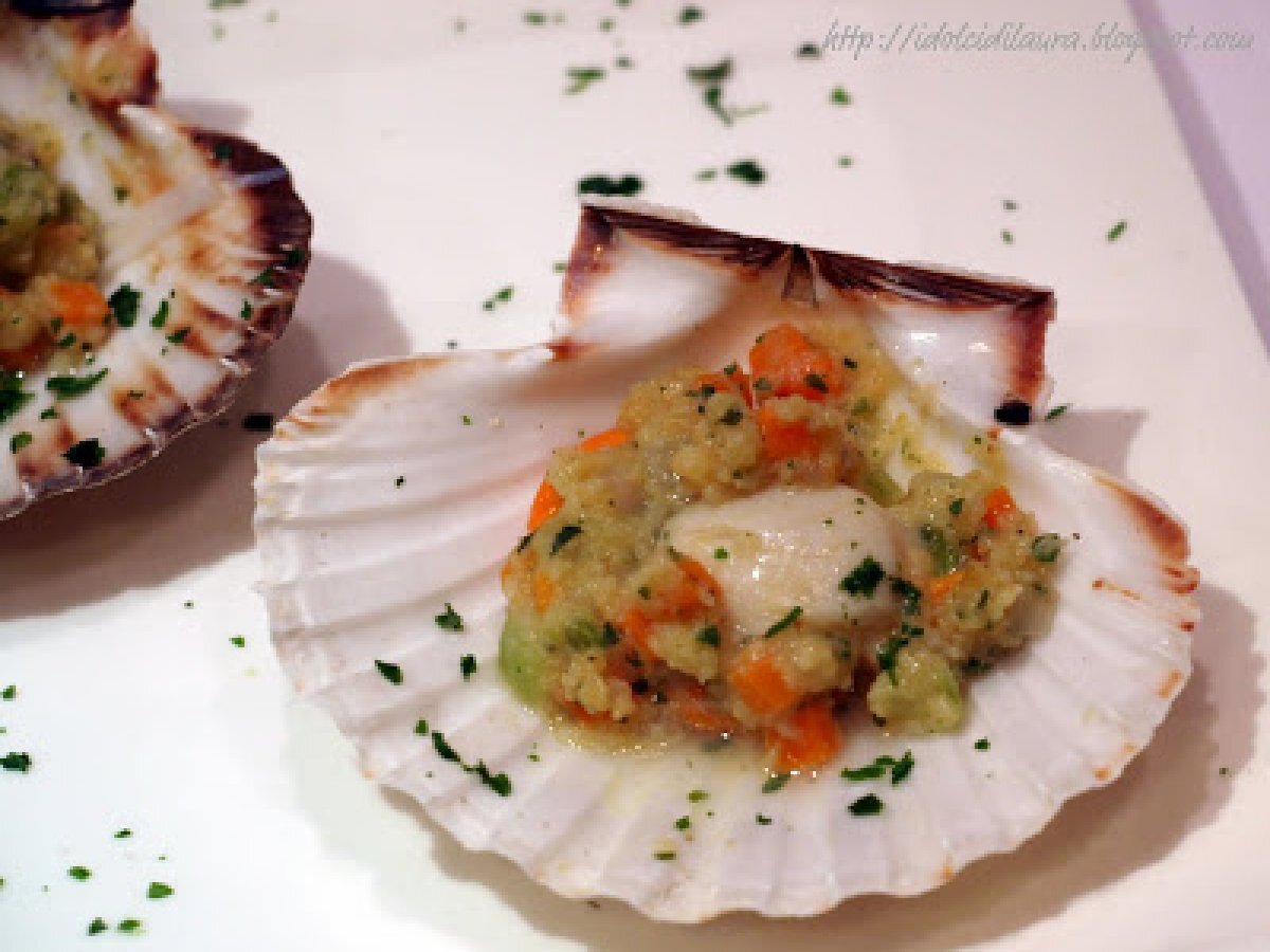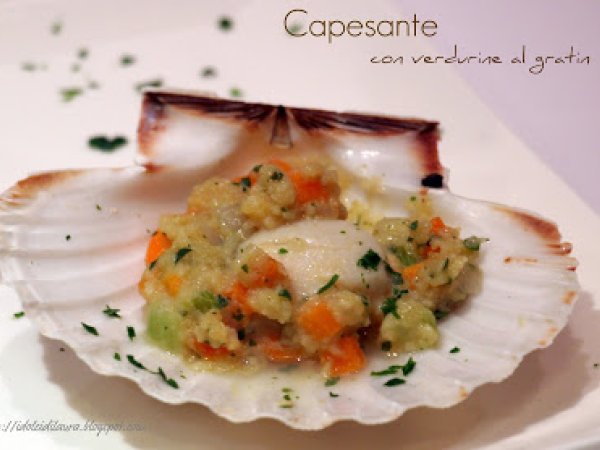 Capesante con verdurine al gratin PrecedenteProssimo Antipastofacile50 min292 Kcal Invia questa ricetta ad un amico Stampa la ricetta Contatta l'autore della Ricetta Pubblica la foto di questa ricetta Ingredienti 4 8 capesante 2 carote piccole 2 zucchine piccole un porro un bicchierino di vino bianco 2 cucchiai di pane grattuggiato 20 g di formaggio grattuggiato 4 cucchiai di panna fresca 60 g di burro sale pepe Costo stimato: 10.06Euros€ (2.51€/Porzioni)