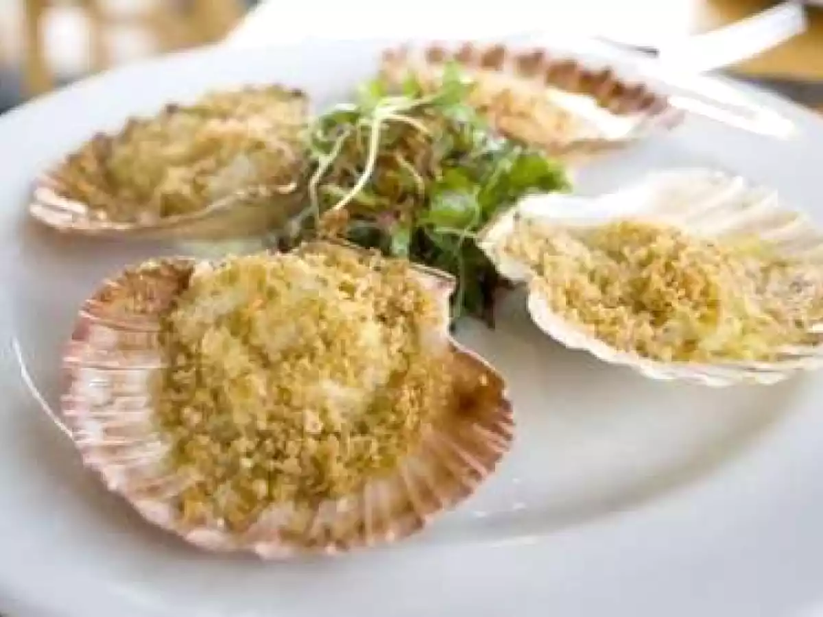 Capesante gratinate Antipastofacile30 min Invia questa ricetta ad un amico Stampa la ricetta Contatta l'autore della Ricetta Pubblica la foto di questa ricetta Ingredienti 4 Ottimo come antipasto, veloce da preparare, sfizioso e molto estivo! Capesante gratinate 02 Jul Ottimo come antipasto, veloce da preparare, sfizioso e molto estivo! Per 4 persone: capesante n. 8 besciamella 2 conf da 250 ml 1 calamaro con ciuffo 500 gr frutti mare aglio e prezzemolo q.b. olio extravergine di oliva pane grattugiato un pizzico pecorino sardo un pizzico Cottura: 10 min