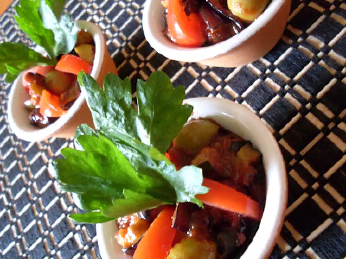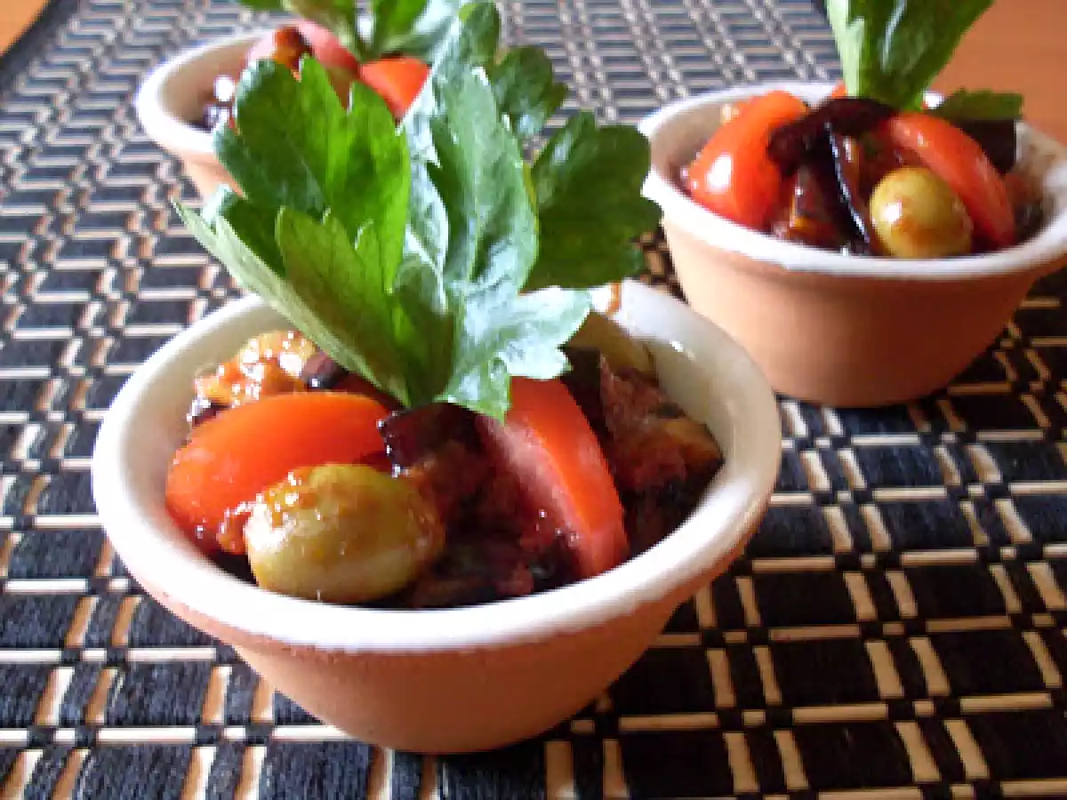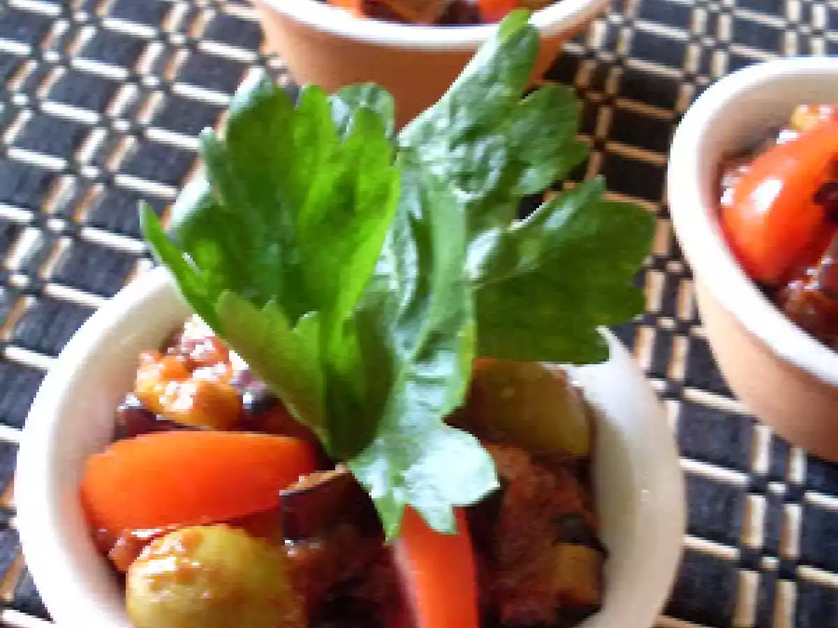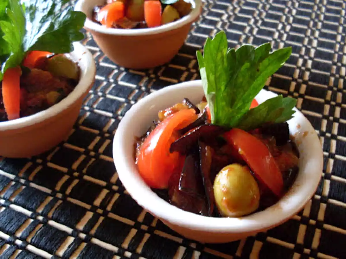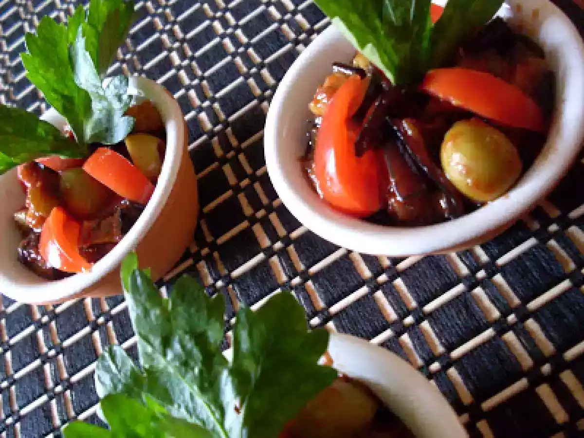 Caponata al cacao... PrecedenteProssimo Antipastofacile20 min344 Kcal Invia questa ricetta ad un amico Stampa la ricetta Contatta l'autore della Ricetta Pubblica la foto di questa ricetta Ed ecco la nostra insolita caponta pronta da gustare. Ingredienti 2 400 g di melanzane oblunghe 150 g di passata di pomodoro una costola di sedano una manciata di olive verdi 1 cucchiaino di capperi un cucchiaino di zucchero un cucchiaio di aceto un cucchiaino scarso di cacao amaro sale Costo stimato: 1.79Euros€ (0.89€/Porzioni)