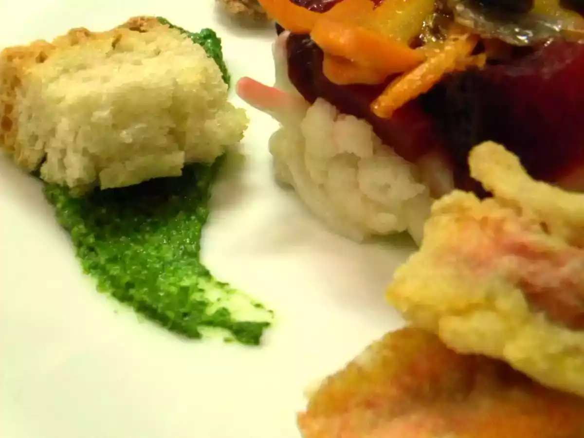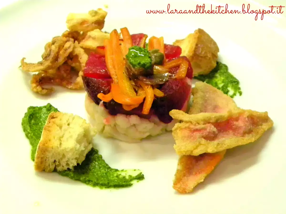 In ogni piatto individuale sistemate al centro un anello di verdure e acciughe composto da cavolfiore alla base, due filetti di acciuga, barbabietola a cubetti e per ultime le carote all'aceto. Decorate la superficie con un'altro filetto di acciuga, un ciuffo di salsa verde e un cappero.
