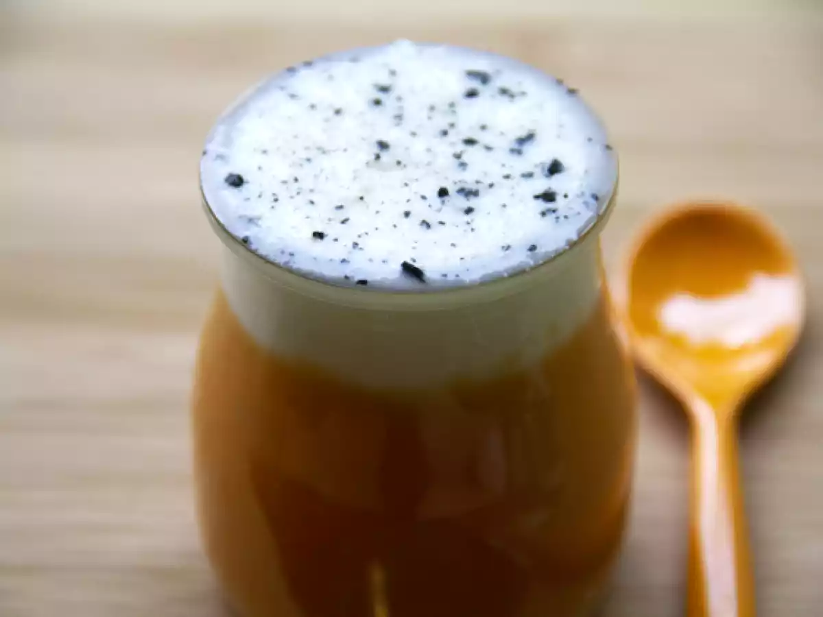 Cappuccino di zucca al cacao Antipastomedia50 min Invia questa ricetta ad un amico Stampa la ricetta Contatta l'autore della Ricetta Pubblica la foto di questa ricetta mmmmmmmh Ingredienti 4 1 zucca Hokkaido di 1,5 kg 500 ml di brodo di pollo istantaneo 300 ml di panna fresca da montare 40 g di burro Mezzo cucchiaino di cacao in polvere Mezzo cucchiaino di caffè solubile 1 cucchiaino di zucchero grezzo di canna Sale Pepe macinato fresco