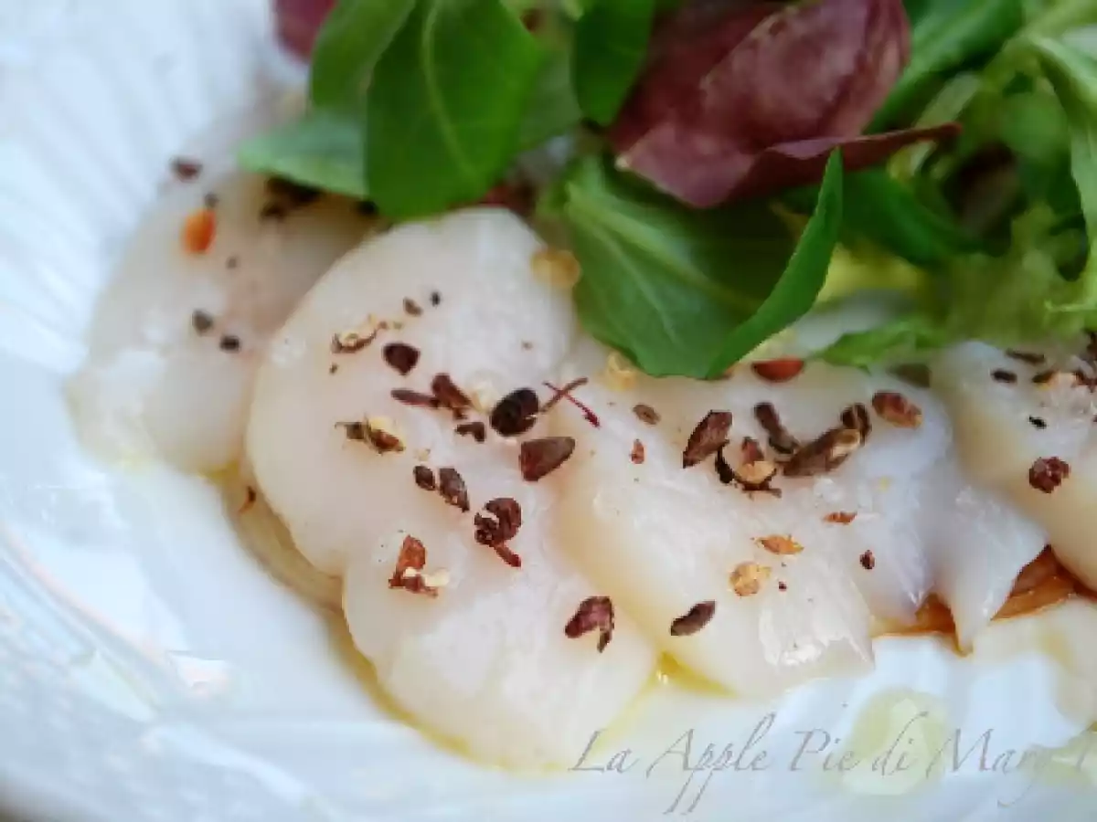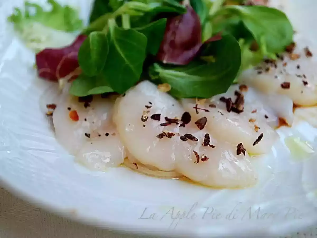 Carpaccio di capesante PrecedenteProssimo Antipastofacile15 min Invia questa ricetta ad un amico Stampa la ricetta Contatta l'autore della Ricetta Pubblica la foto di questa ricetta Ingredienti 4 8 noci di capesante ½ scalogno banana piccolo 100 g misticanza di insalatine olio extravergine di oliva fiori commestibili (nasturzio, camomilla, petali di girasole) (facoltativi) salsa di soia pepe di Zhichuan sale in scaglie