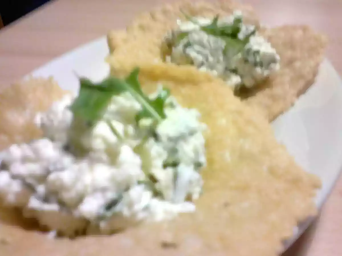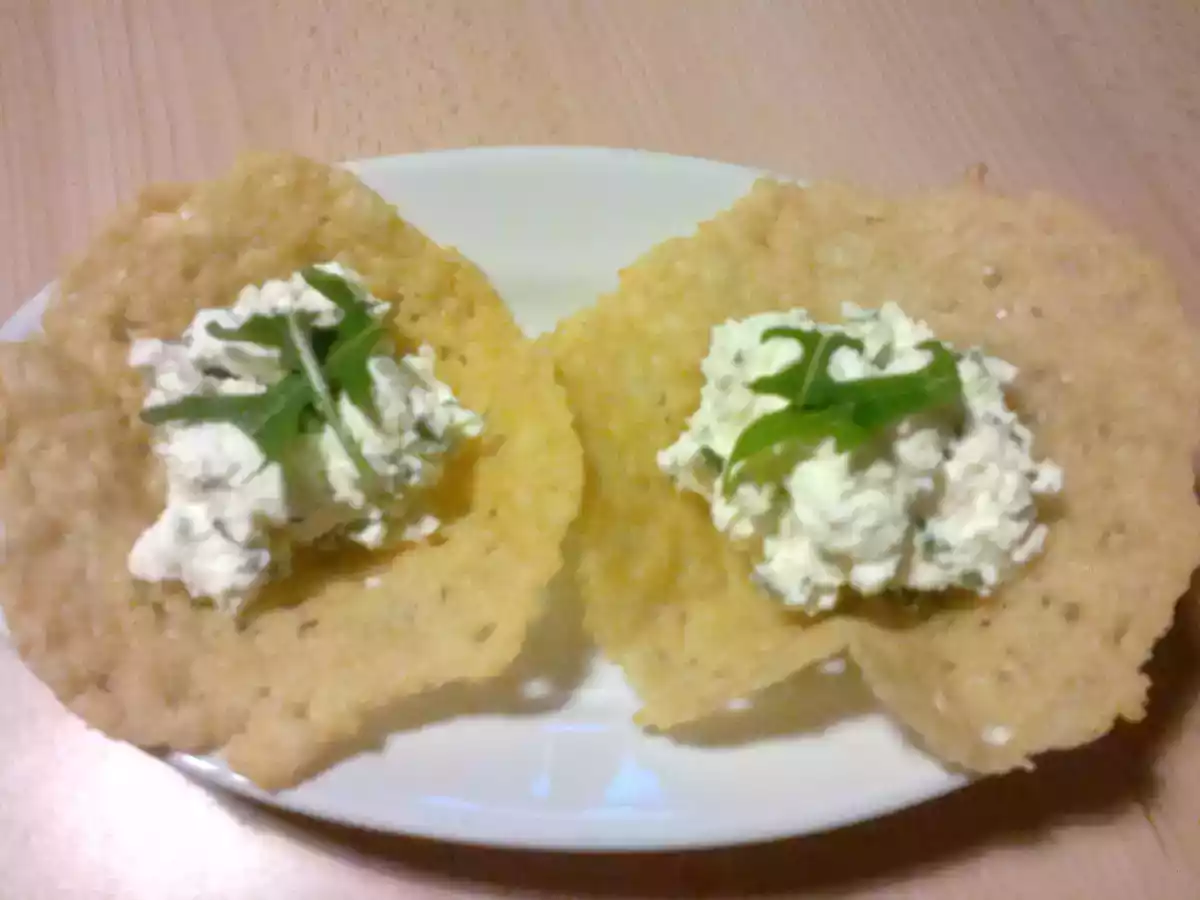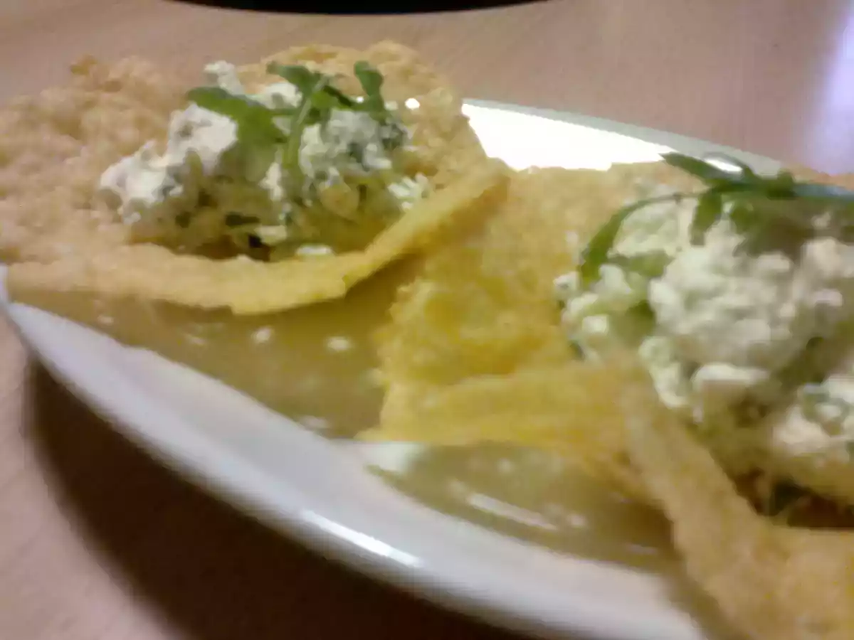 Simpatici cestini di parmigiano serviti con robiola e rucola. Un'idea fresca e gustosa!