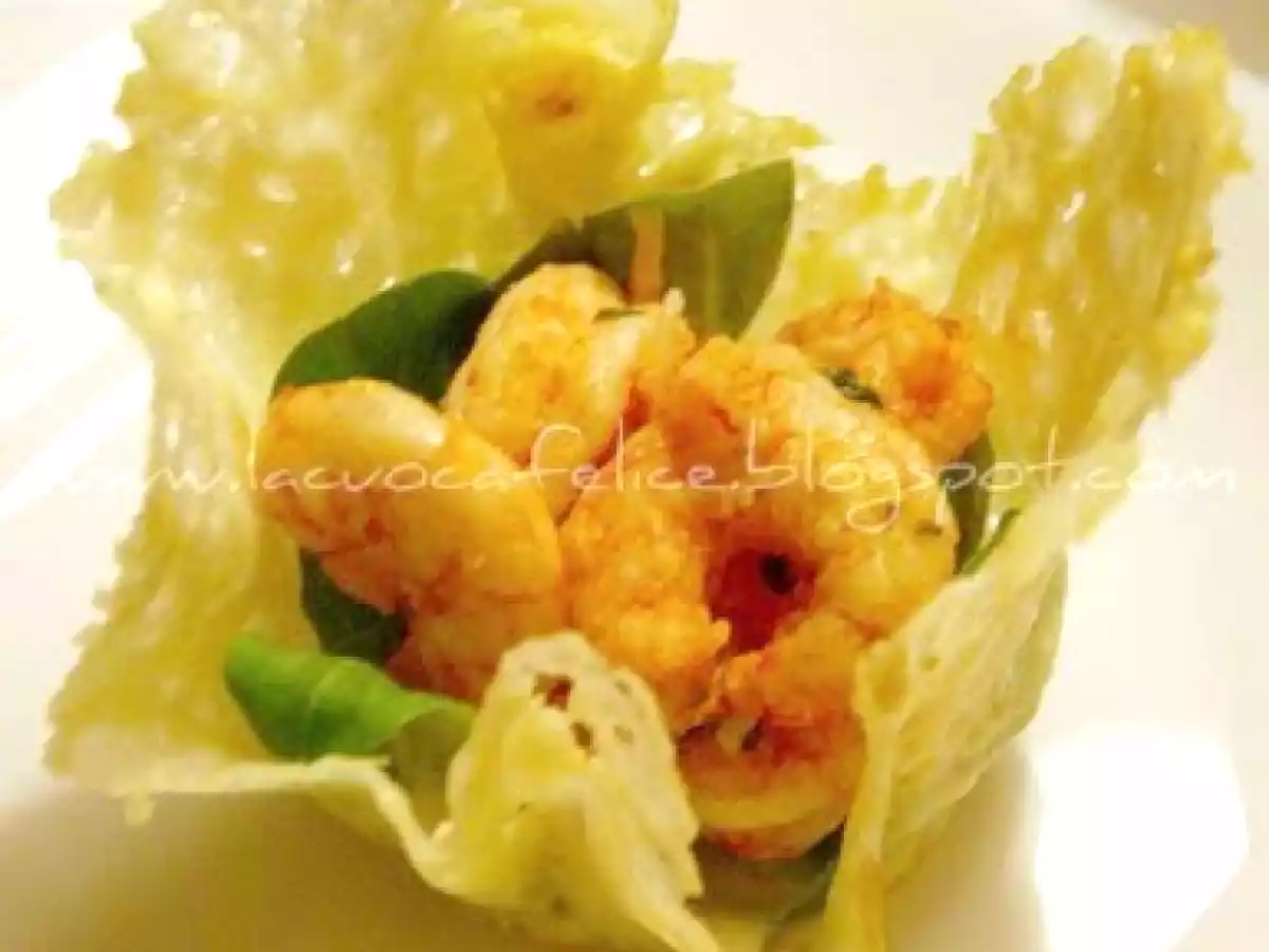 Cestini di parmigiano con gamberi e maionese bianca al gorgonzola