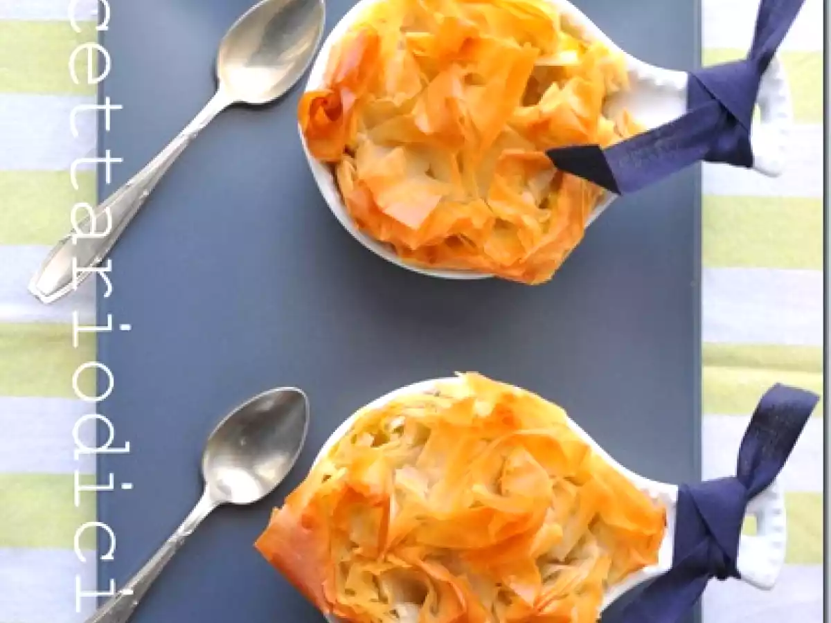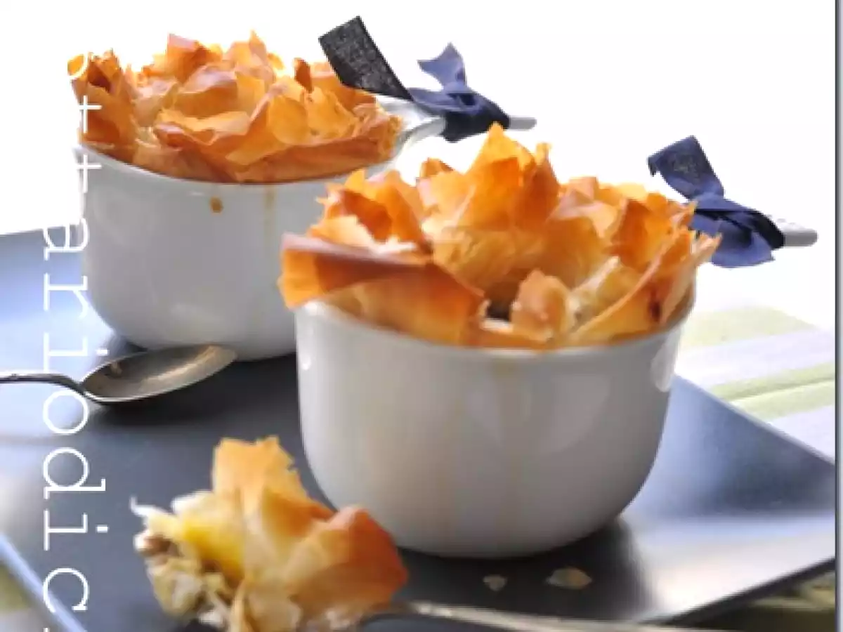 Cocotte radicchio roquefort in pasta fillo vota adesso PrecedenteProssimo Antipastofacile50 min Invia questa ricetta ad un amico Stampa la ricetta Contatta l'autore della Ricetta Pubblica la foto di questa ricetta Ingredienti 4 6 fogli pasta fillo 1 ciuffo radicchio di Treviso 2 uova 50 g di roquefort 50 g di panna fresca burro, fuso