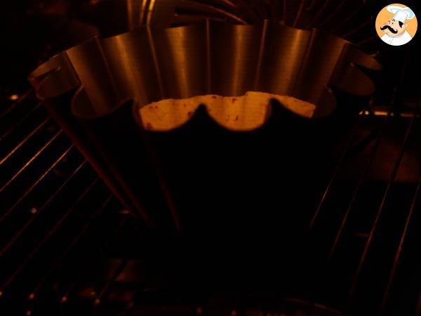 Fatto questo, sarà più semplice posizionarla nello stampo. Pressate con le dita per sistemarla bene e cuocete in forno per 8 minuti.