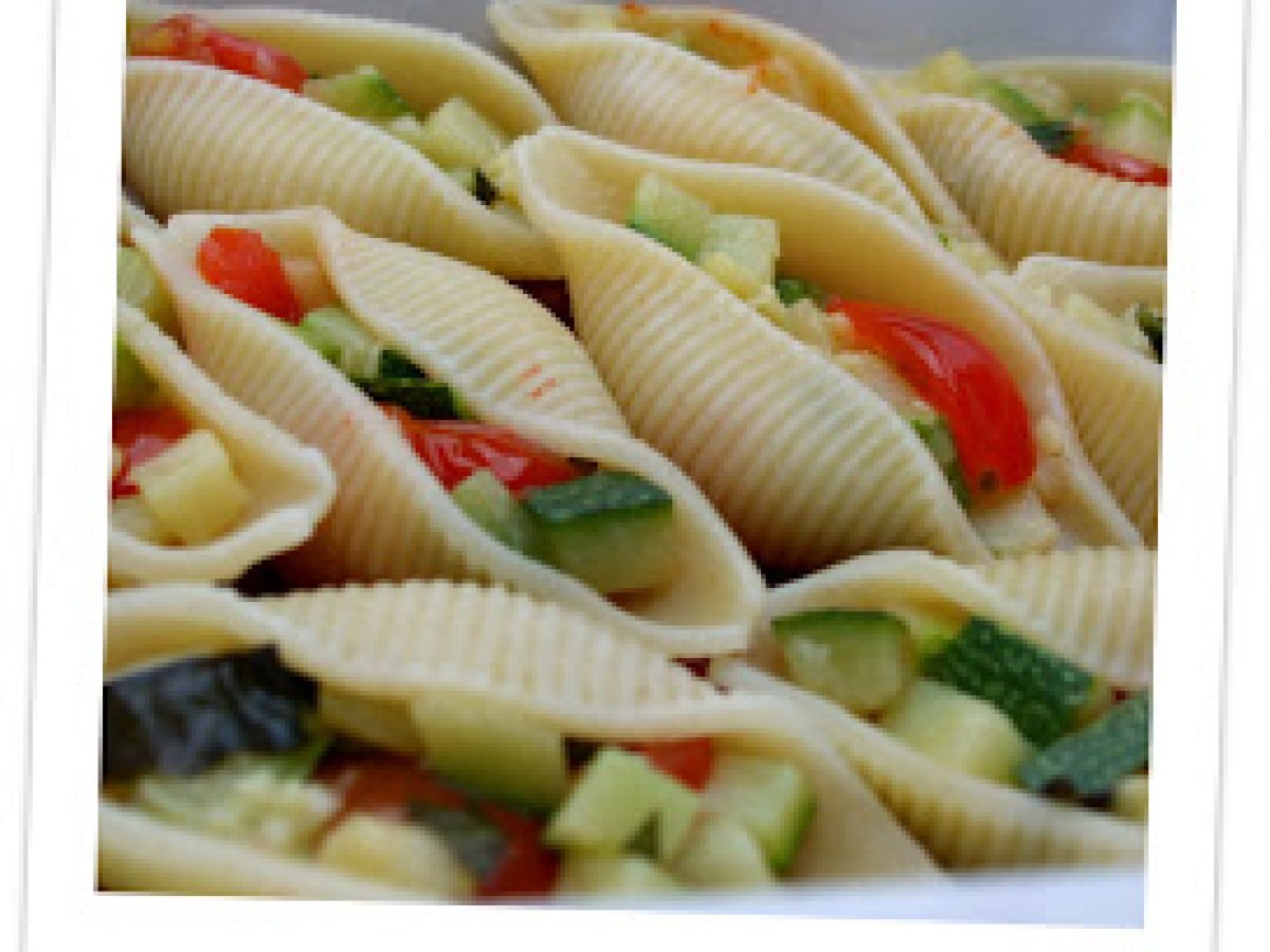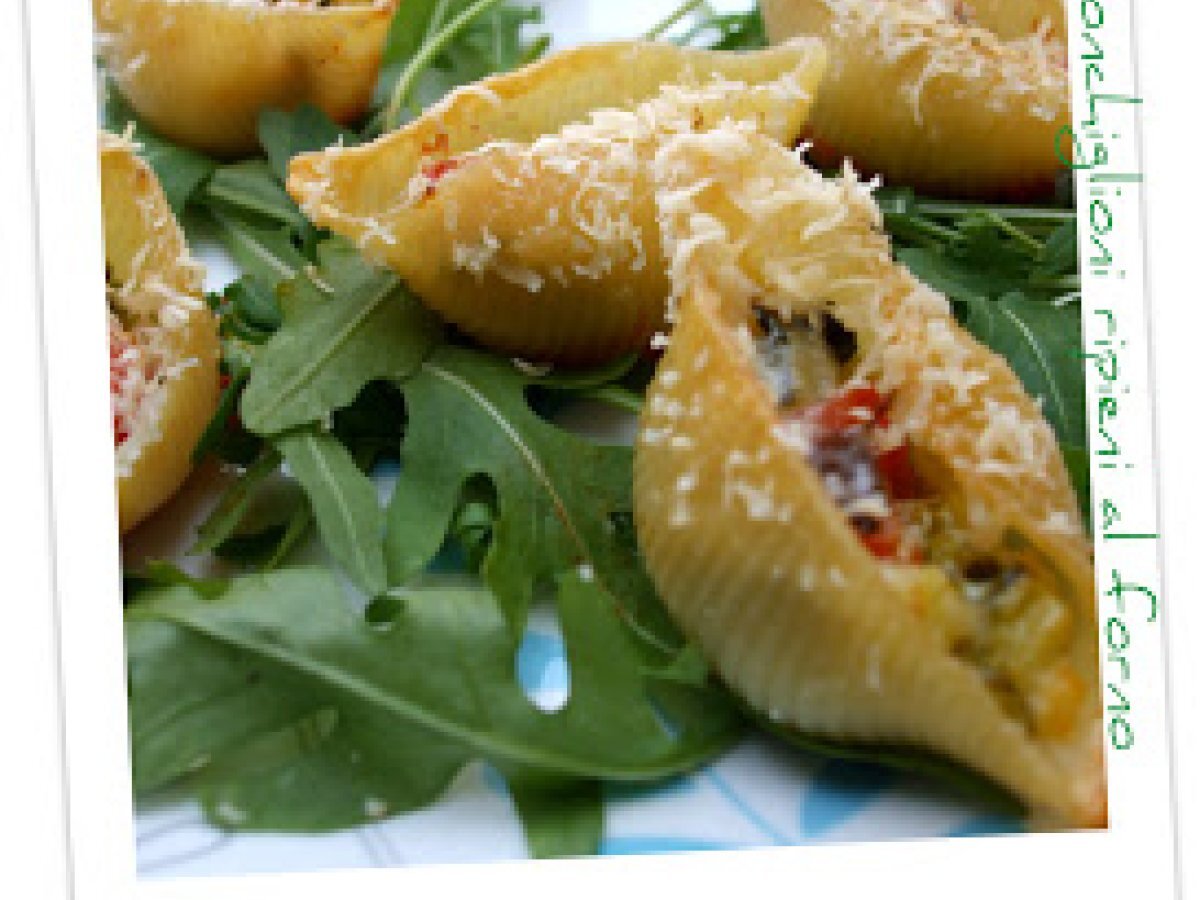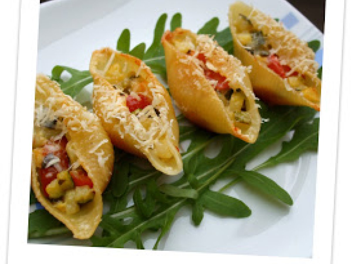 Conchiglioni ripieni, al forno PrecedenteProssimo Antipastofacile1 ora Invia questa ricetta ad un amico Stampa la ricetta Contatta l'autore della Ricetta Pubblica la foto di questa ricetta È bello vedere e bene mangiare. Ingredienti 4 300 g di conchiglioni 450 g di zucchine 200 g di pomodorini foglie di basilico un ciuffo di origano fresco 1/2 cipolla 200 g di parmigiano a scaglie olio extravergine d'oliva sale