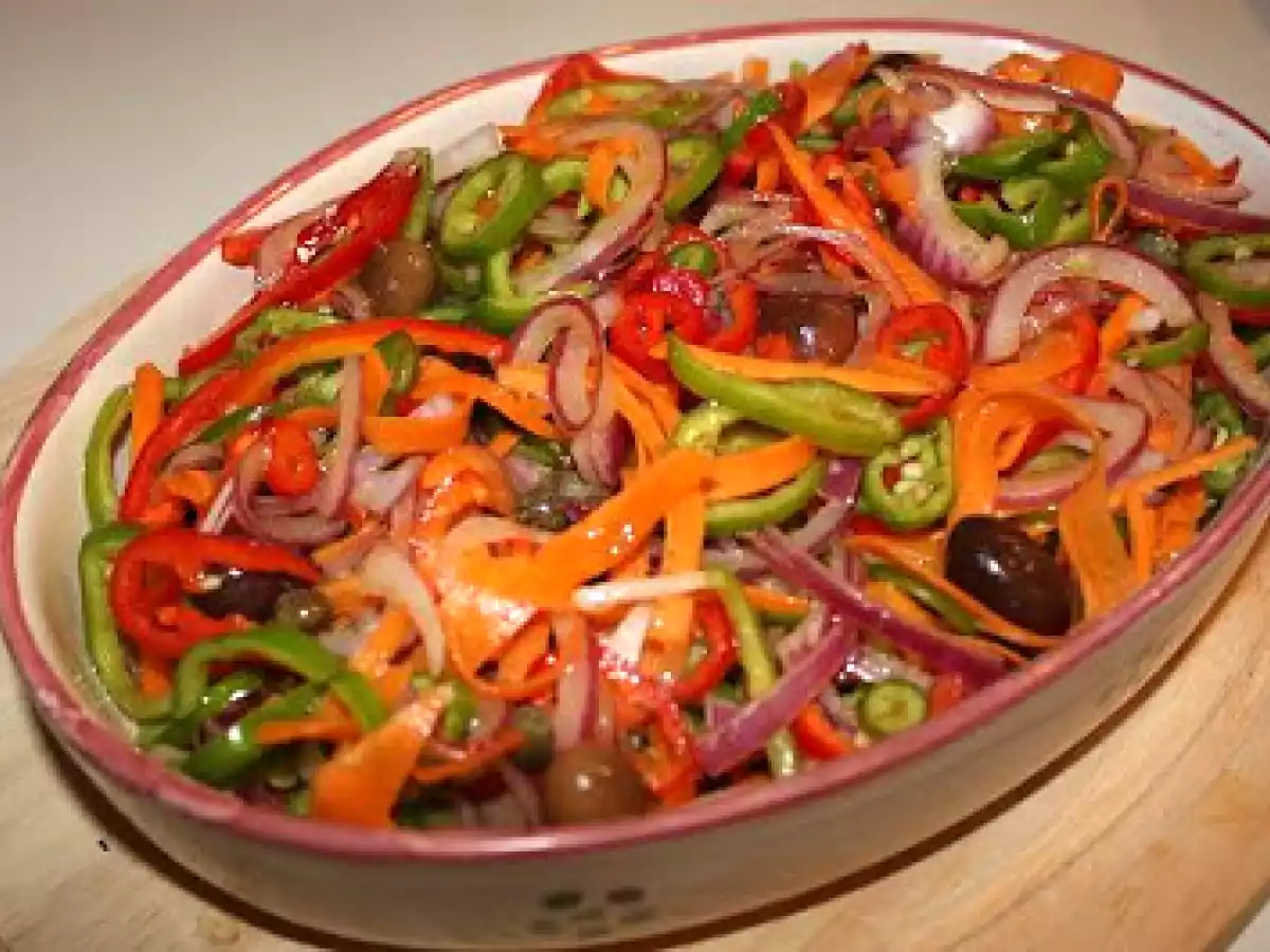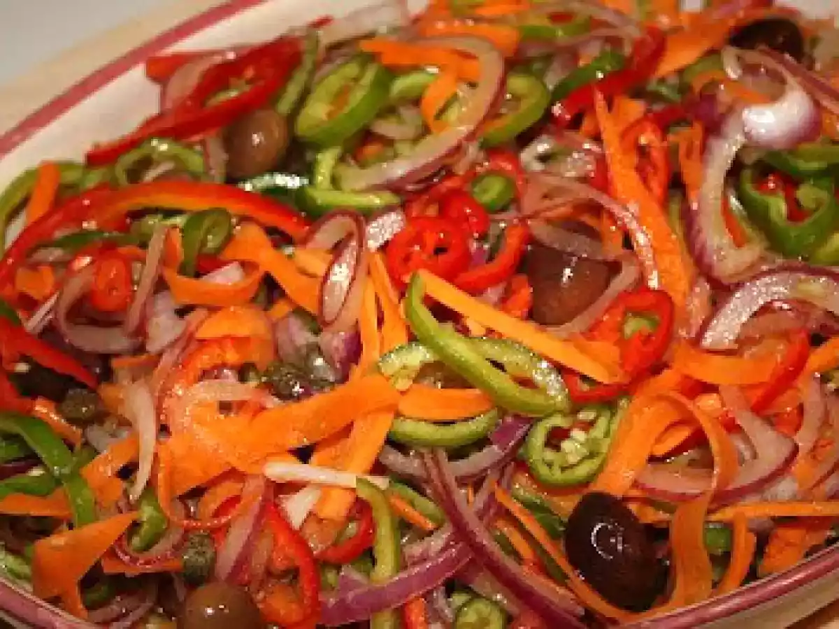 - Affettare cornetti, cipolla e carote molto sottili. Unire tutti gli ingredienti e mescolare bene, lasciare insaporire per qualche oretta e servire.