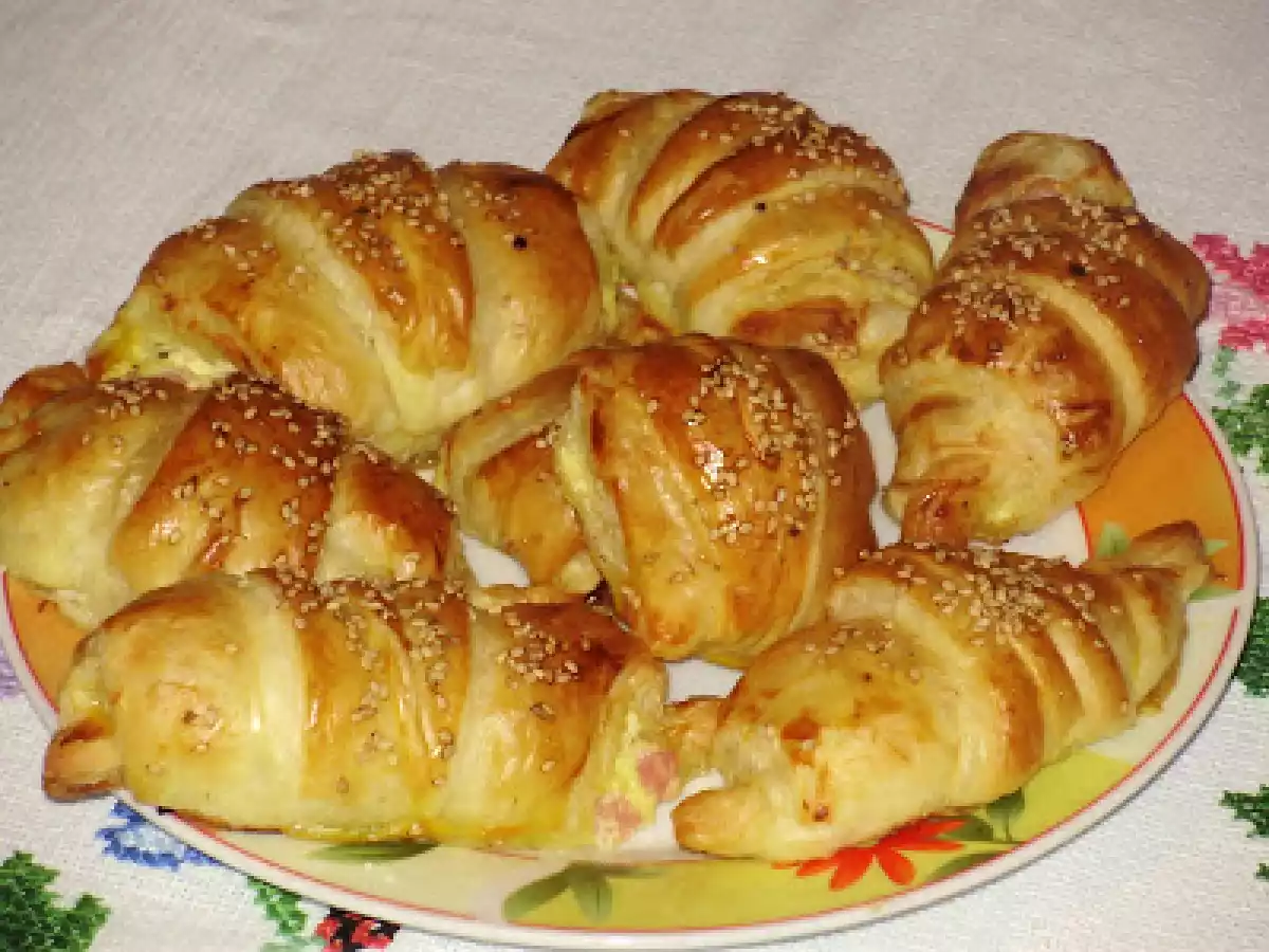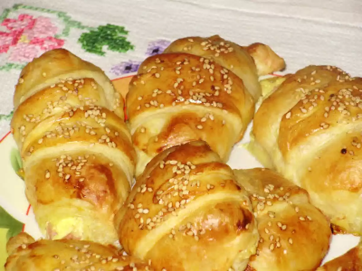 Cornetti alla crescenza e ricotta PrecedenteProssimo Antipastofacile1 ora425 Kcal Invia questa ricetta ad un amico Stampa la ricetta Contatta l'autore della Ricetta Pubblica la foto di questa ricetta Ingredienti 6 300 g di pasta sfoglia 100 g di crescenza 50 g di ricotta 100 g di prosciutto a cubetti 2 tuorli parmigiano semi di sesamo sale e pepe