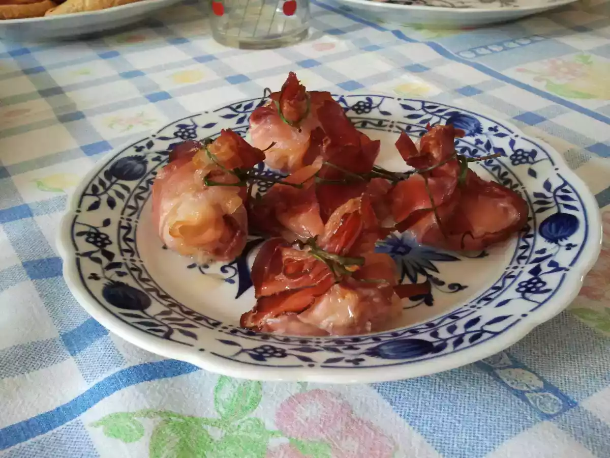 Fagottini di speck e mozzarella PrecedenteProssimo Antipastofacile18 min Invia questa ricetta ad un amico Stampa la ricetta Contatta l'autore della Ricetta Pubblica la foto di questa ricetta Facili e veloci, questi fagottini sono anche molto buoni! Ingredienti 5 Ogni involtino è composto da: 2 fette di speck 2 palline di mozzarella 2 fili di erba cipollina (per chiuderli)
