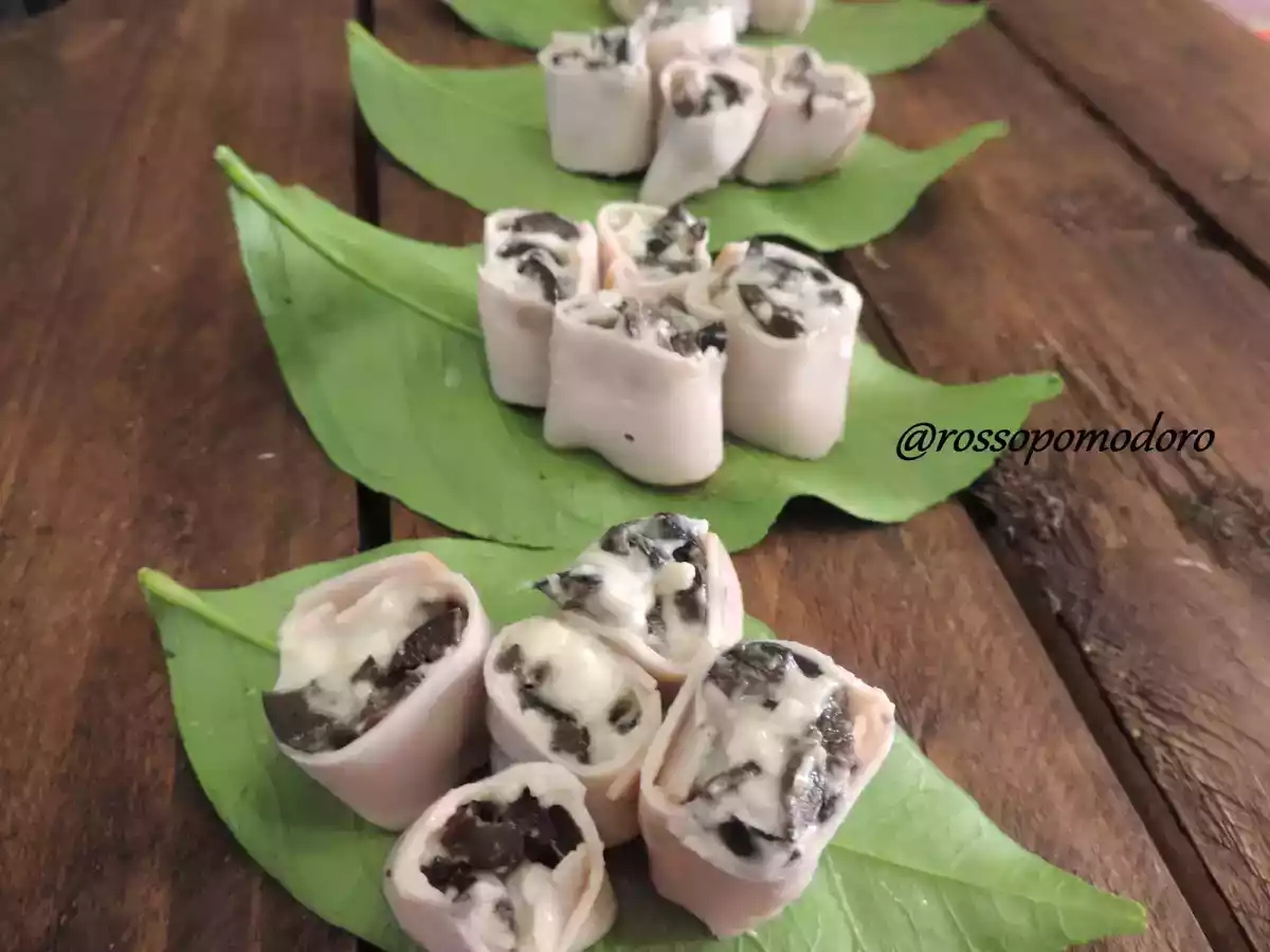 Gustosi rotolini di tacchino arrosto farciti con stracchino e olive nere