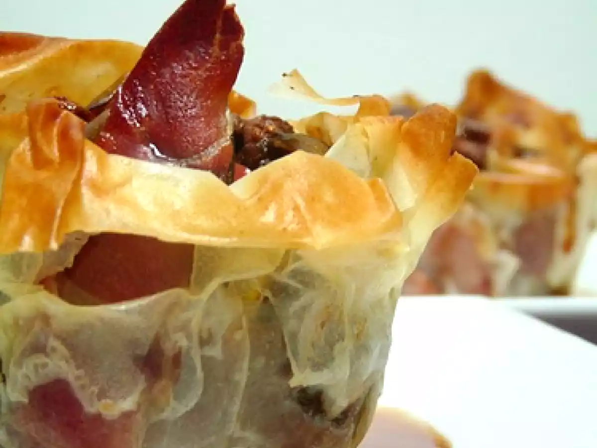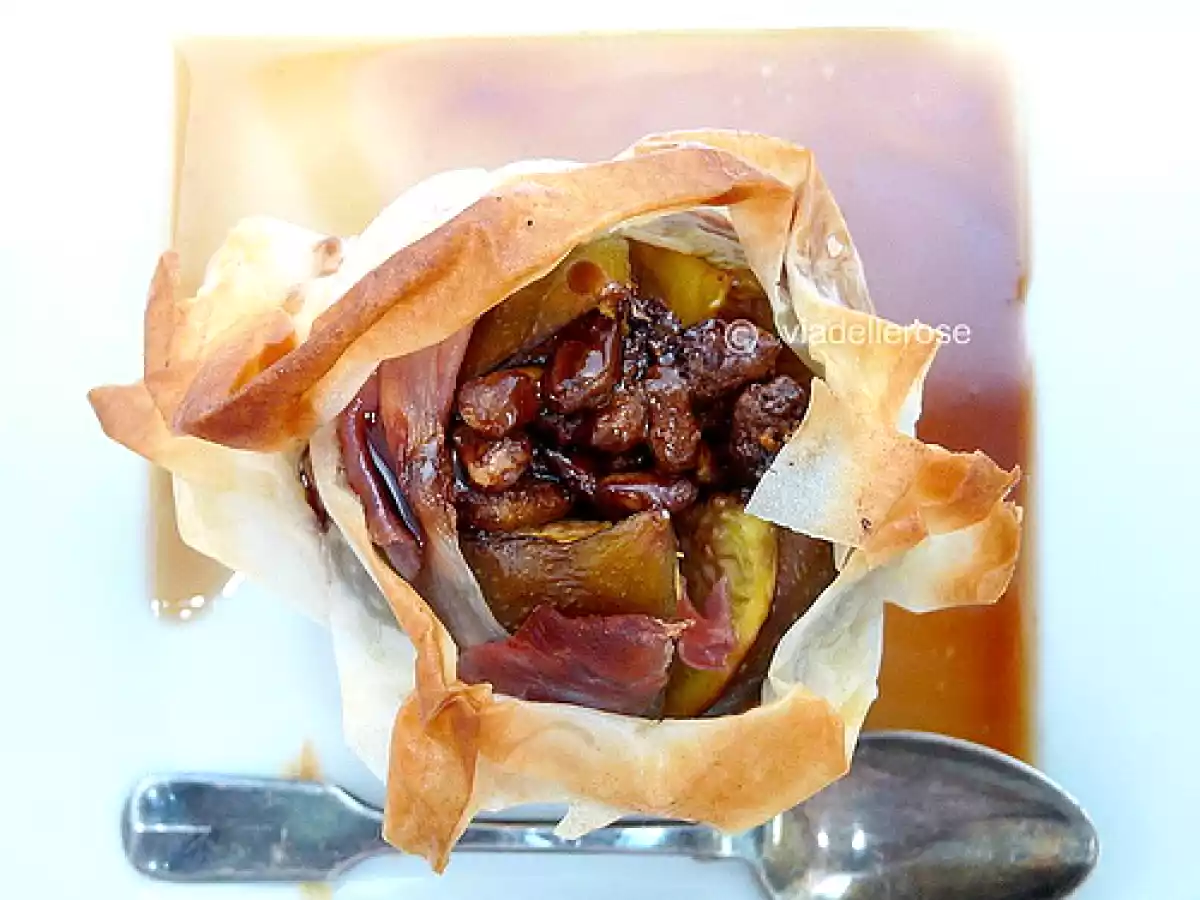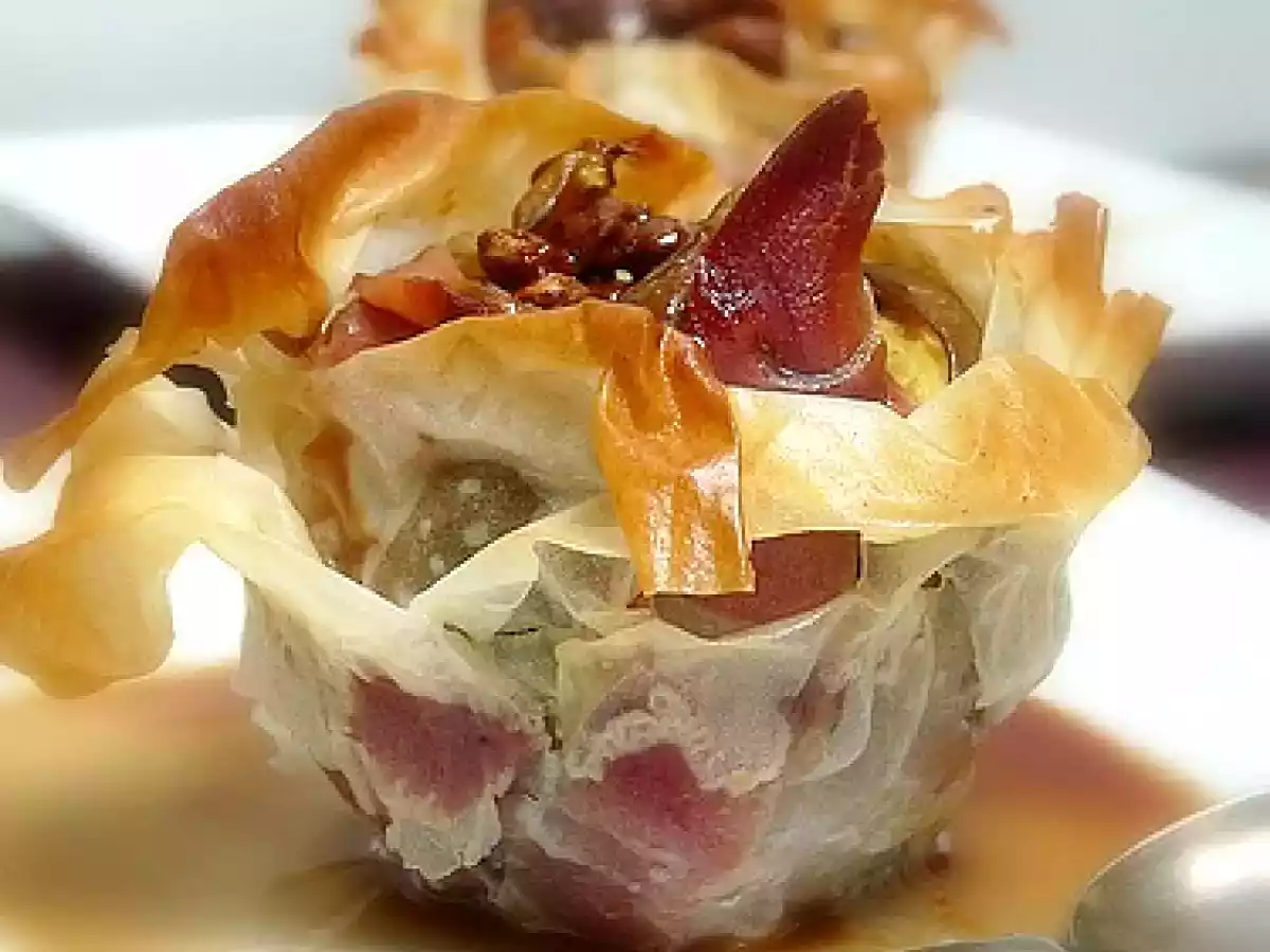 Fiore di fichi e prosciutto in pasta fillo e salsa al vino rosso PrecedenteProssimo Antipastofacile28 min303 Kcal Invia questa ricetta ad un amico Stampa la ricetta Contatta l'autore della Ricetta Pubblica la foto di questa ricetta Un antipasto veloce e gourmet Ingredienti 4 4 fichi viola 4 fette di prosciutto crudo 2 fogli di pasta fillo 20 g di burro fuso un cucchiaio di pinoli caramellati Per la salsa al vino: 250 g di vino rosso 2 cucchiai di zucchero di canna Costo stimato: 8.45Euros€ (2.11€/Porzioni)