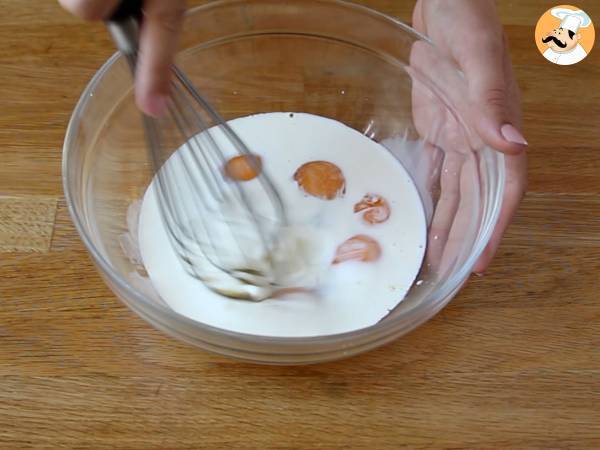 Grattugiate le zucchine e frullatele velocemente. In una ciotola mescolate le uova intere, i 2 tuorli, la panna fresca ed il latte.