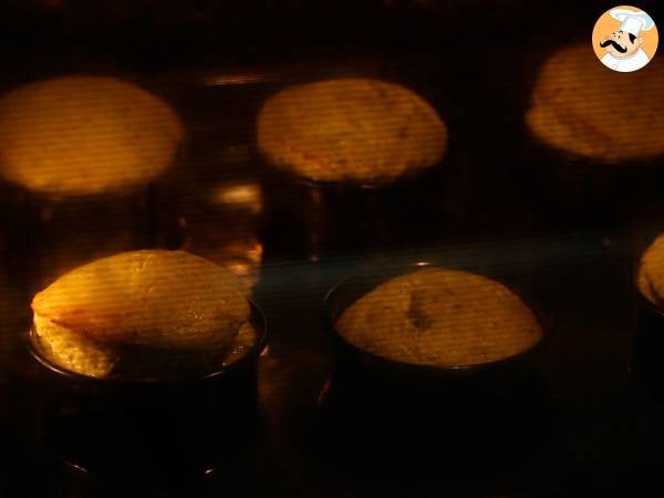 Ora versate l'impasto negli stampi imburrati. Cuocete in forno a bagno maria per 35 minuti a 180°C.