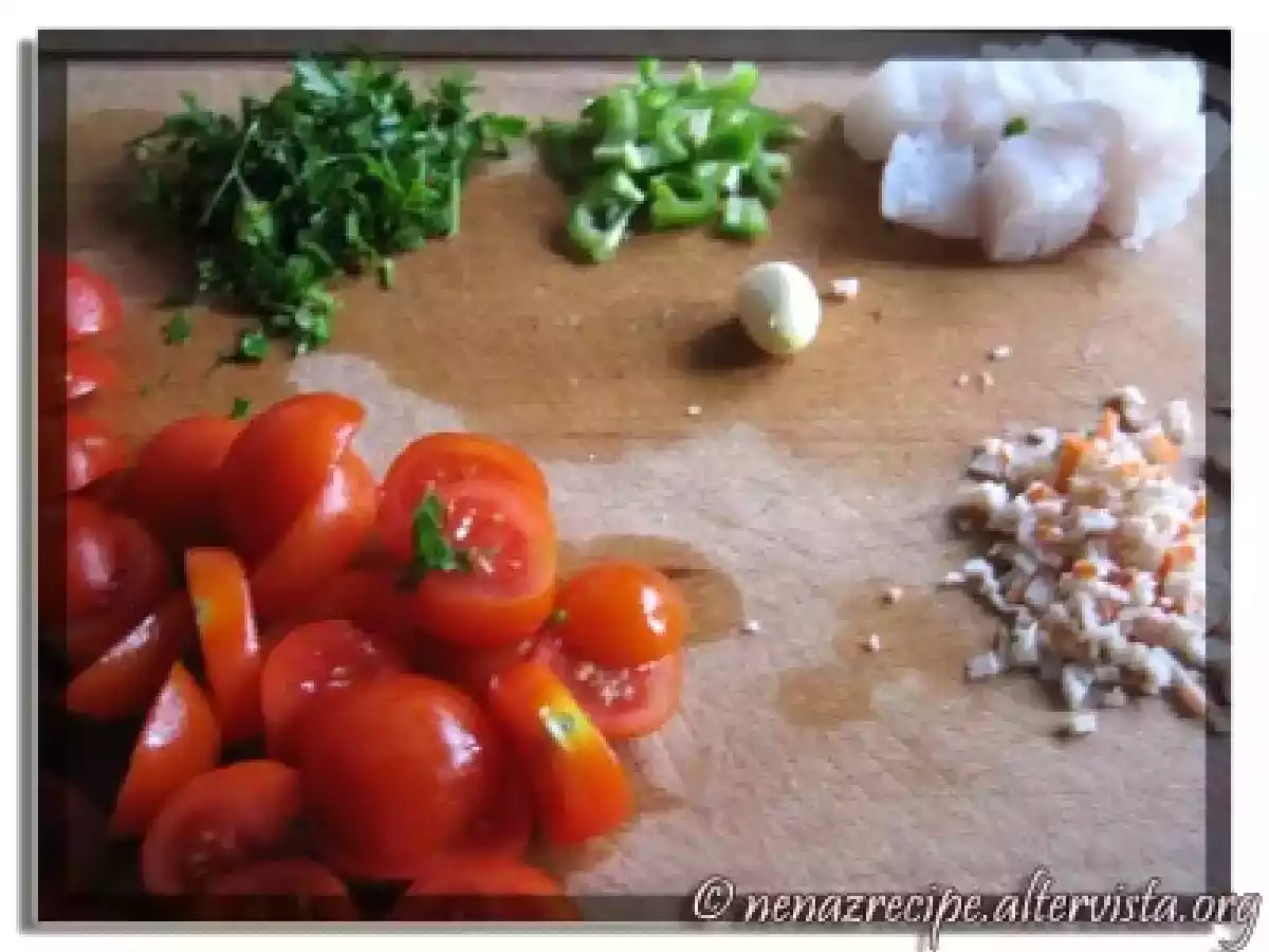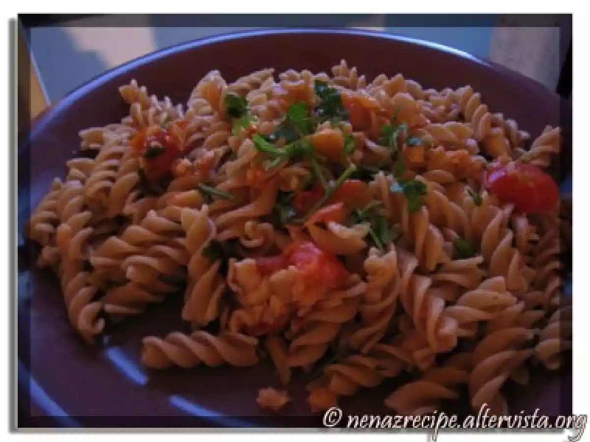 Fusilli integrali con sugo di merluzzo PrecedenteProssimo Antipastofacile32 min341 Kcal Invia questa ricetta ad un amico Stampa la ricetta Contatta l'autore della Ricetta Pubblica la foto di questa ricetta Un'entrata con pasta molto succulente. Ingredienti 2 160 g di fusilli integrali 7-8 pomodorini 1 spicchio d’aglio 30 g merluzzo 1 bastoncino di surimi 1 cucchiaino d’olio extravergine di oliva 2 foglie di basilico 1 pizzico di sale