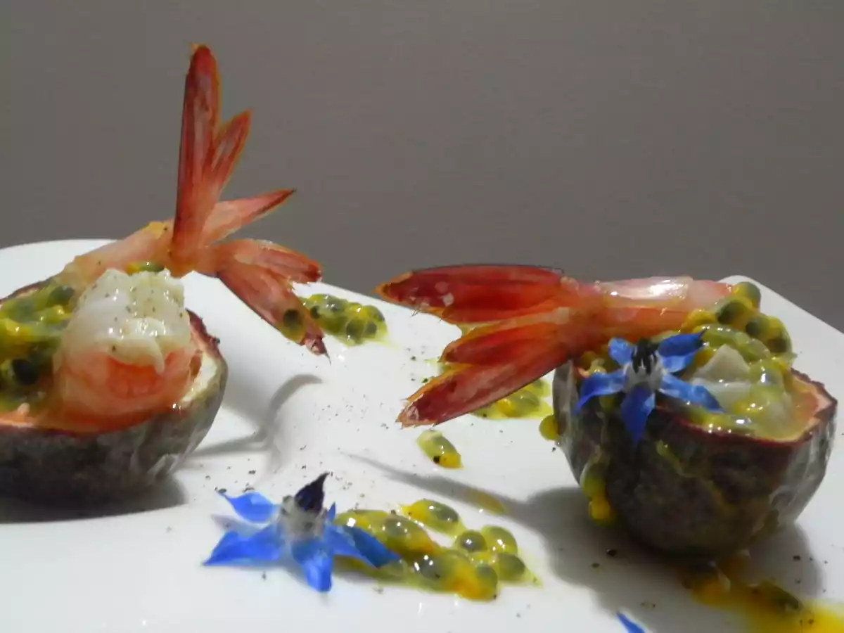 Gamberi di sanremo marinati al frutto di passione e vodka PrecedenteProssimo Antipastomedia50 min153 Kcal Invia questa ricetta ad un amico Stampa la ricetta Contatta l'autore della Ricetta Pubblica la foto di questa ricetta Un fantastico antipasto da preparare con i gamberi freschi Ingredienti 4 8 Gamberi Rossi 4 Frutti della Passione Zenzero q.b. 1/2 Limone 50 ml Vodka Olio d'Oliva Extra Vergine q.b Sale q.b Pepe q.b