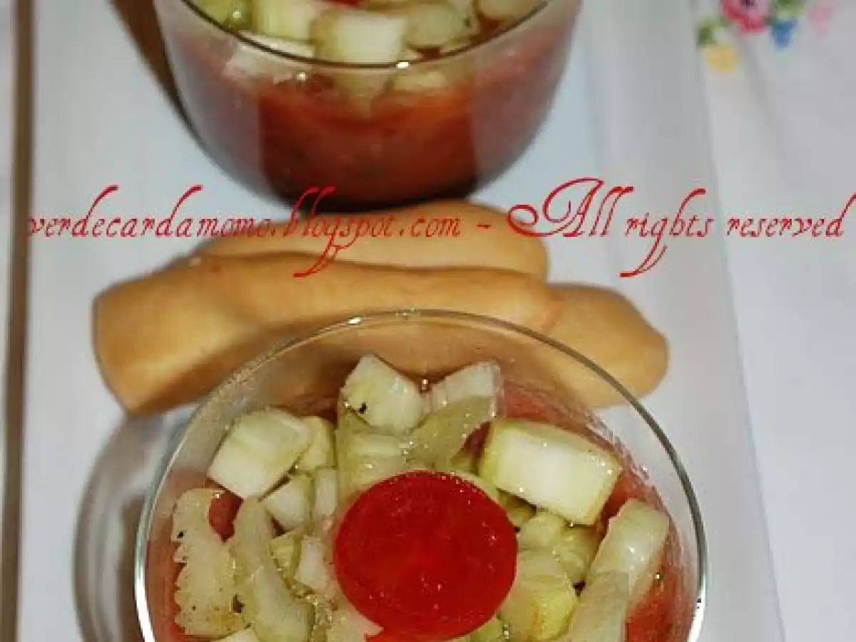 Gelatina di pomodoro e cuore di sedano vota adesso PrecedenteProssimo Antipastofacile40 min149 Kcal Invia questa ricetta ad un amico Stampa la ricetta Contatta l'autore della Ricetta Pubblica la foto di questa ricetta Ingredienti 4 650 G di pomodori piccadilly di Sicilia un cuore di sedano 20 g di gelatina in fogli olio sale peperoncino Costo stimato: 3.86Euros€ (0.96€/Porzioni)