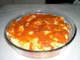 - Tagliare il rotolo ottenuto, in 2 parti uguali. Ricoprire la terrina di porcellana con qualche cucchiaio di salsa di pomodoro e sistemare sopra le girelle.