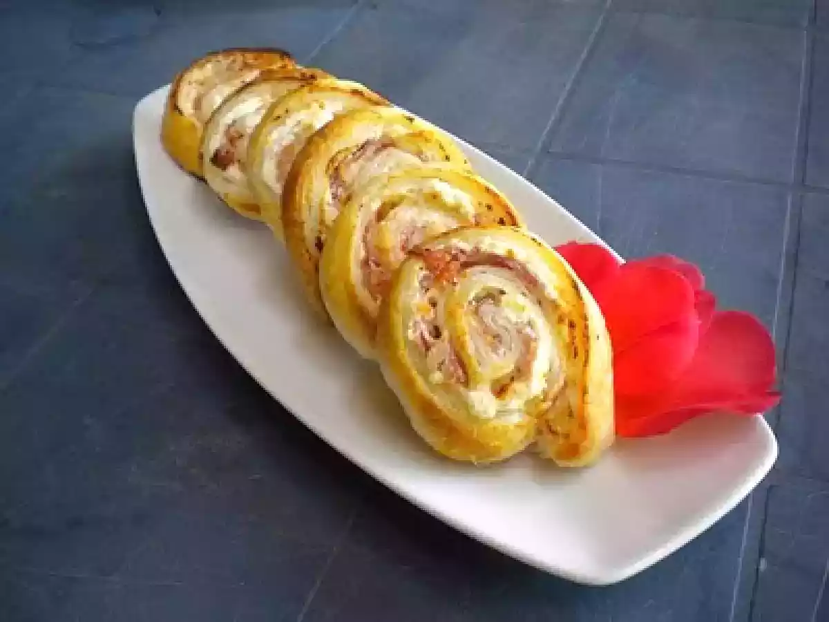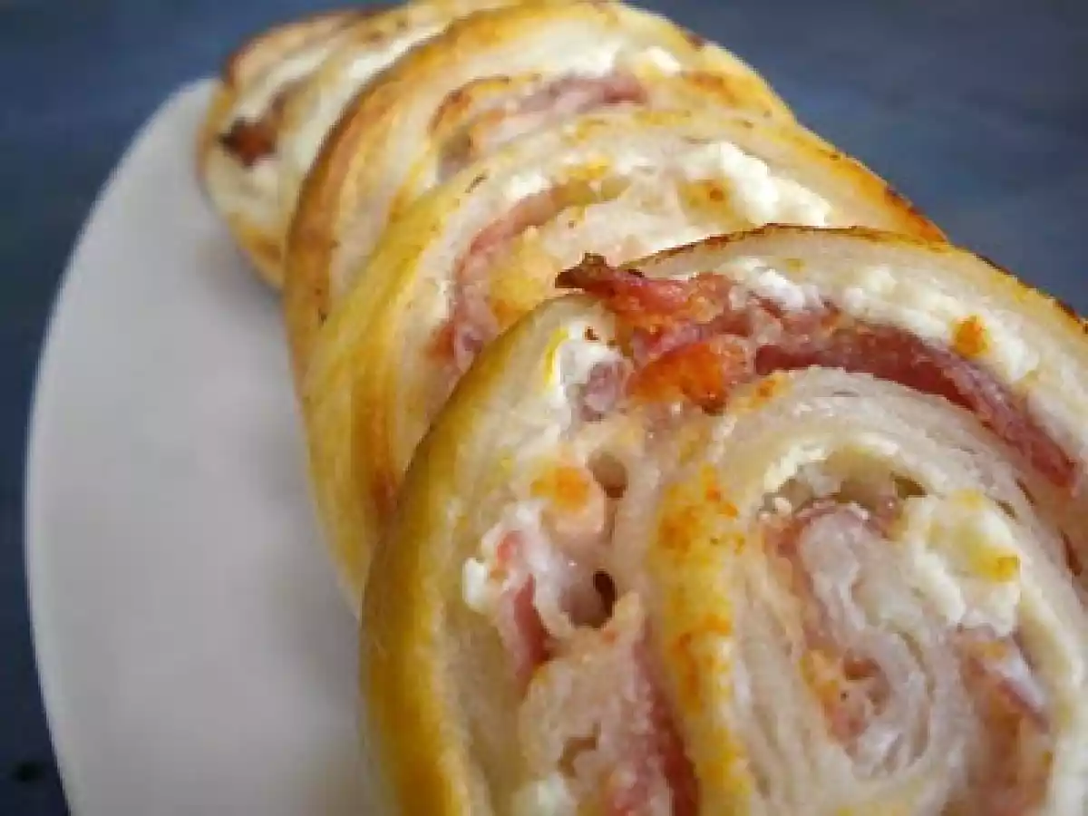 - Stendere la sfoglia e ricoprirla bene con il Philadelphia. Ricoprire con la pancetta e spolverare con il parmigiano e il pecorino.