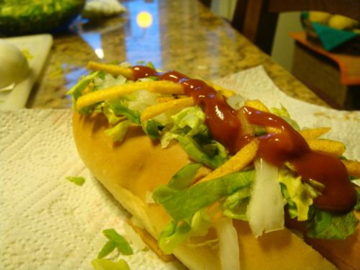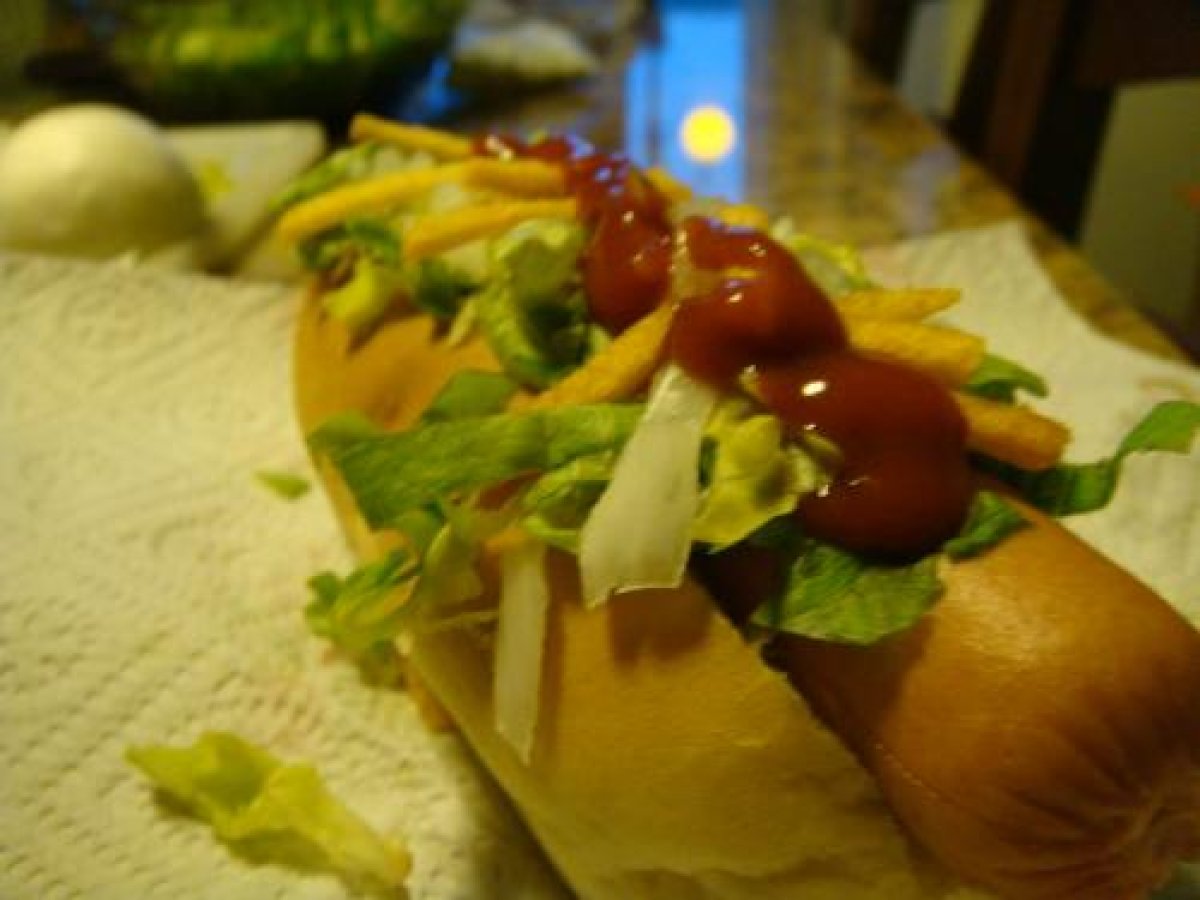 Hot dog venezuela (perro caliente) PrecedenteProssimo Antipastofacile30 min Invia questa ricetta ad un amico Stampa la ricetta Contatta l'autore della Ricetta Pubblica la foto di questa ricetta Più necessità di comperare del hot dog con questi ricette. Ingredienti 2 Panini per Hot Dog Wurstel fini Lattuga Cipolla Patatine San Carlo Sticki Ketchup Maionese Senape