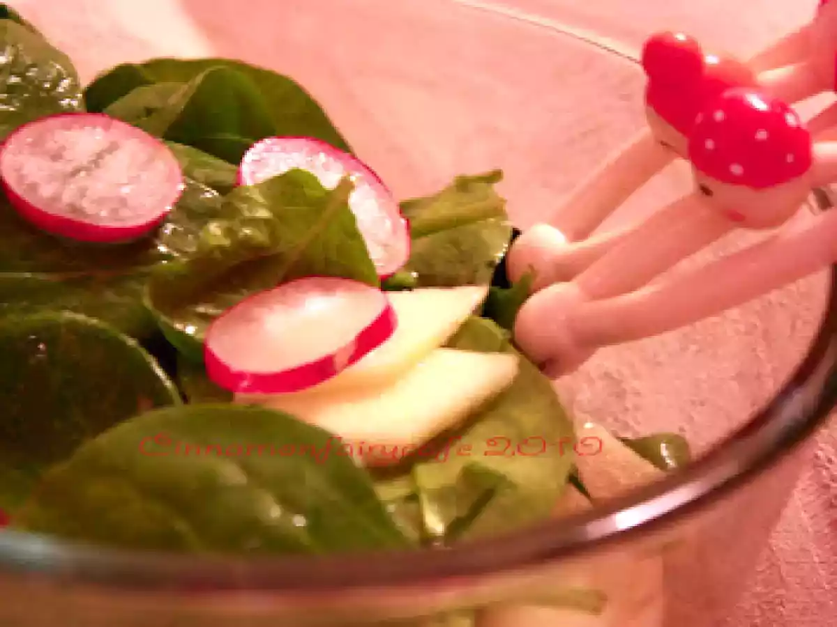 Insalata croccante di ravanelli e mele Antipastofacile20 min Invia questa ricetta ad un amico Stampa la ricetta Contatta l'autore della Ricetta Pubblica la foto di questa ricetta Ingredienti 4 Spinaci a foglia piccola, freschi e crudi Ravanelli Mela verde Olio evo Sale