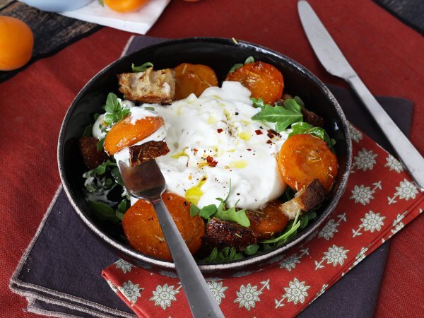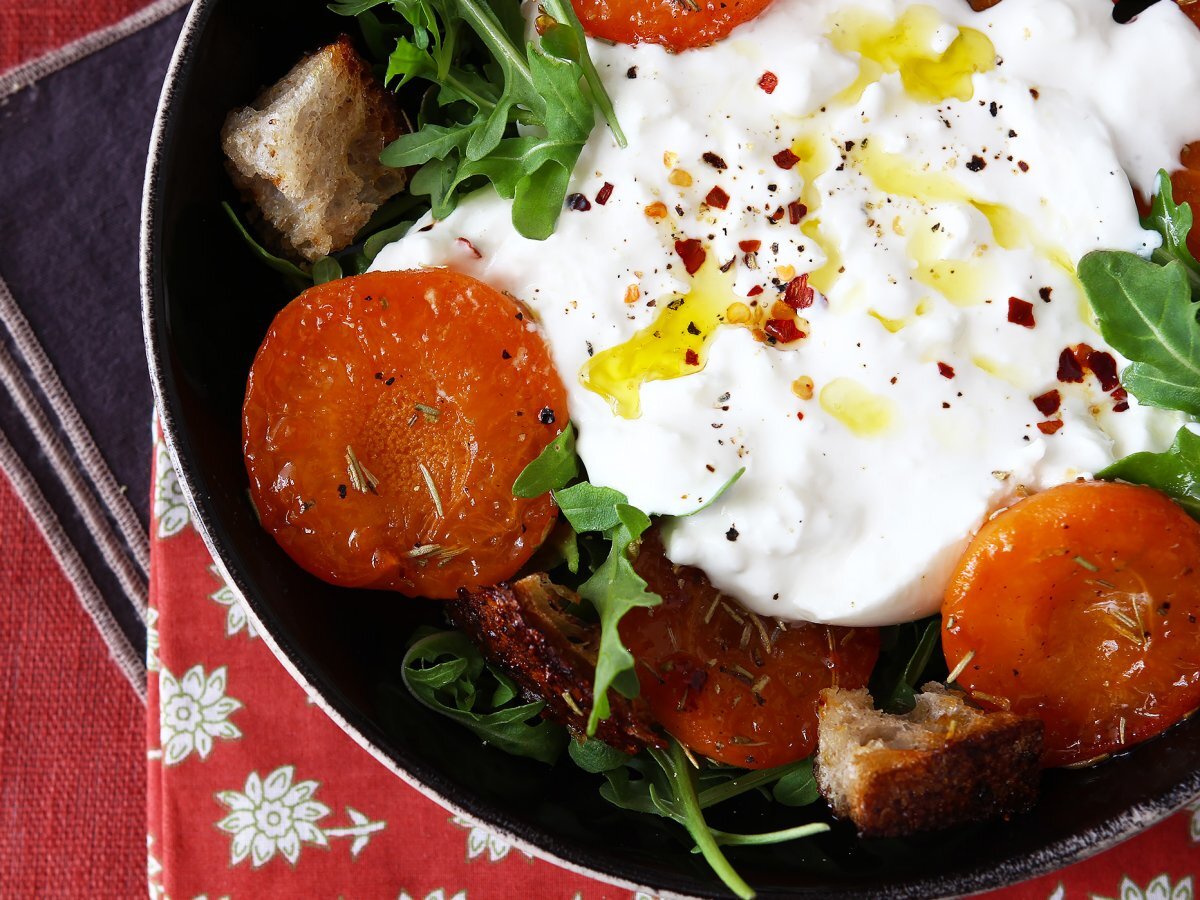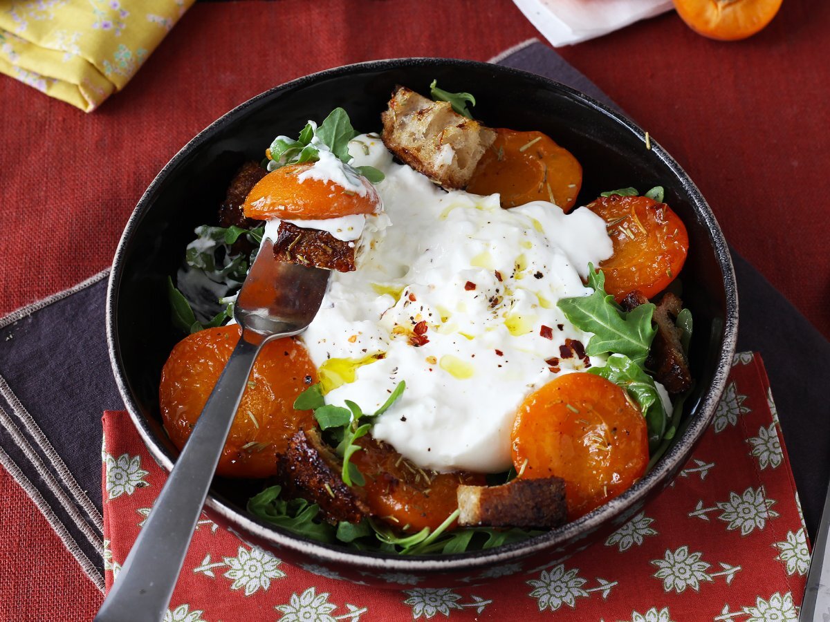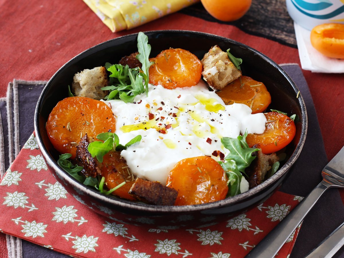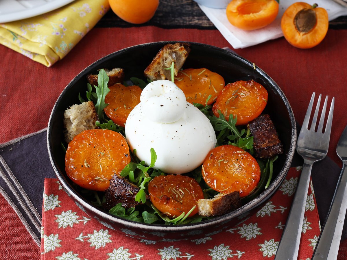 Insalata di albicocche arrostite, rucola e burrata: facile e raffinata