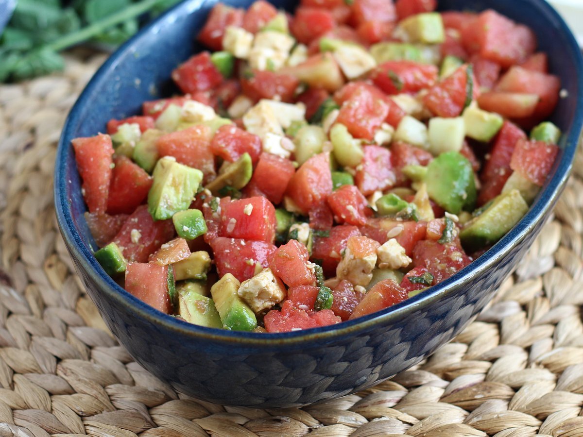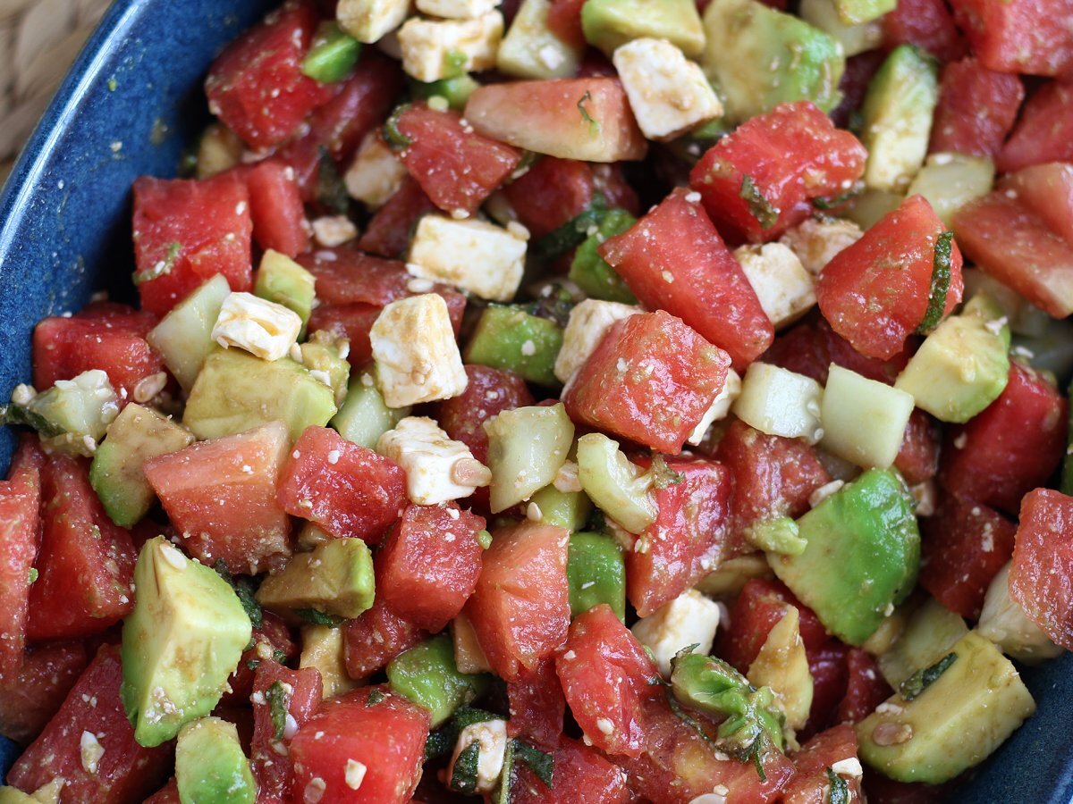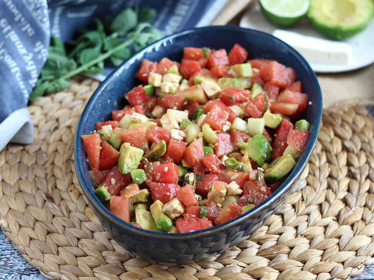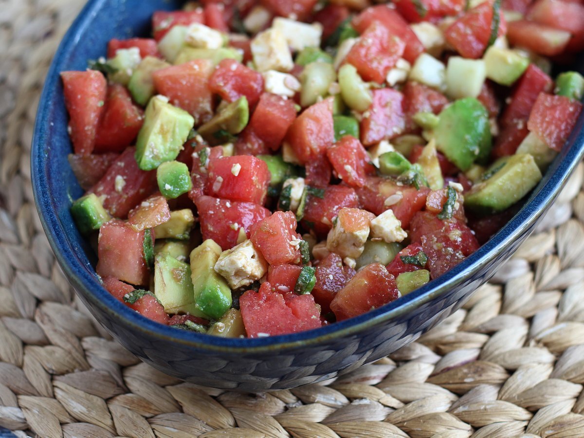 Insalata di anguria, feta, avocado e cetriolo: super fresca!