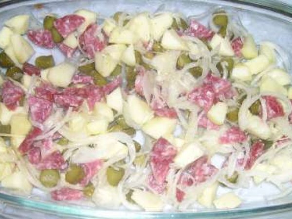 Insalata di mele cipolla e salame Antipastofacile15 min280 Kcal Invia questa ricetta ad un amico Stampa la ricetta Contatta l'autore della Ricetta Pubblica la foto di questa ricetta Ingredienti 4 1 mela grossa non troppo matura; 150 gr di salame cacciatorino; 1 cipolla bianca media; 15 cetriolini sott'aceto; 2 cucchiai di aceto bianco; 3 cucchiai di olio e.v.o. sale, pepe; 1/2 cucchiaino da caffè di zucchero; Costo stimato: 4.18Euros€ (1.04€/Porzioni)