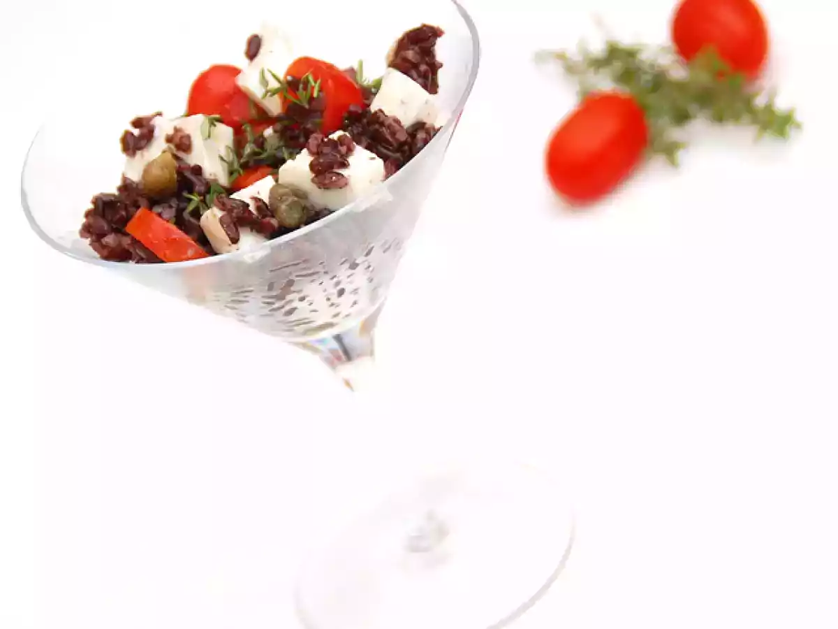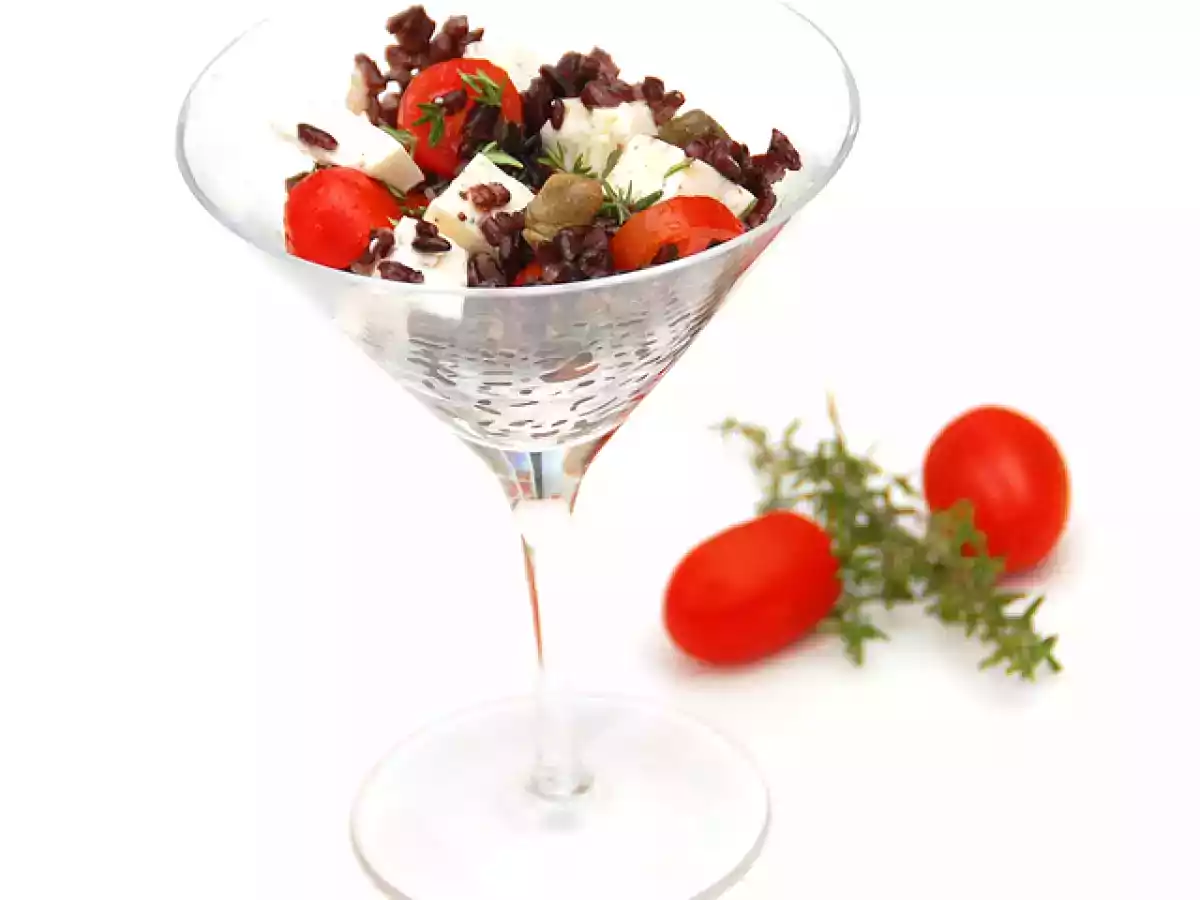 Insalata di riso nero al primo sale pomodorini e olive PrecedenteProssimo Antipastofacile35 min Invia questa ricetta ad un amico Stampa la ricetta Contatta l'autore della Ricetta Pubblica la foto di questa ricetta Un'idea fresca e gustosa da servire come antipasto. Ingredienti 4 400 g di riso nero 200 g di primo sale 200 g di pomodorini datterini 100 g di olive nere snocciolate un mazzetto aromatico 1 cucchiaio di capperi sotto sale 4 cucunci sotto sale 1 cucchiaino di succo di limone 10 g di sedano verde timo fresco olio EVO aceto di mele sale e pepe