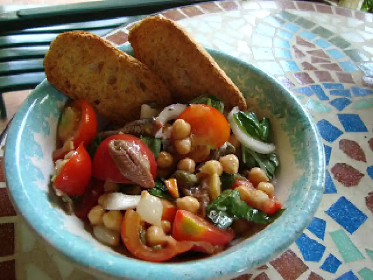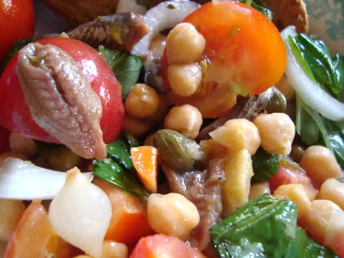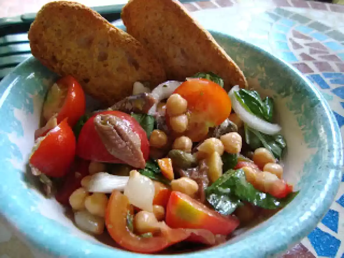 Insalata estiva di ceci PrecedenteProssimo Antipastofacile15 min Invia questa ricetta ad un amico Stampa la ricetta Contatta l'autore della Ricetta Pubblica la foto di questa ricetta Ingredienti 4 eci alici sott'olio verdure tipo condi riso pomodorini pachino cipolla basilico olio evo e origano