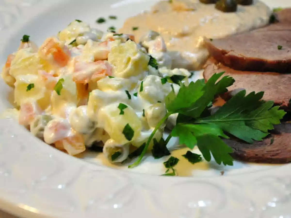 Insalata russa e vitello tonnato vota adesso Antipastofacile55 min Invia questa ricetta ad un amico Stampa la ricetta Contatta l'autore della Ricetta Pubblica la foto di questa ricetta Ingredienti 4 1) Insalata russa Carote, patate, carote in uguale quantità 250 g circa maionese 2) Vitello con salsa tonnata 800 g magatello 1 carota, 1 sedano, 1 cipolla sale e pepe per la salsa 250 g maionese 200 g tonno sott'olio 2 cucchianini capperi in salamoia 2 cetrioli sott'aceto 4 acciughe sott'olio 1 cucchiaino senape