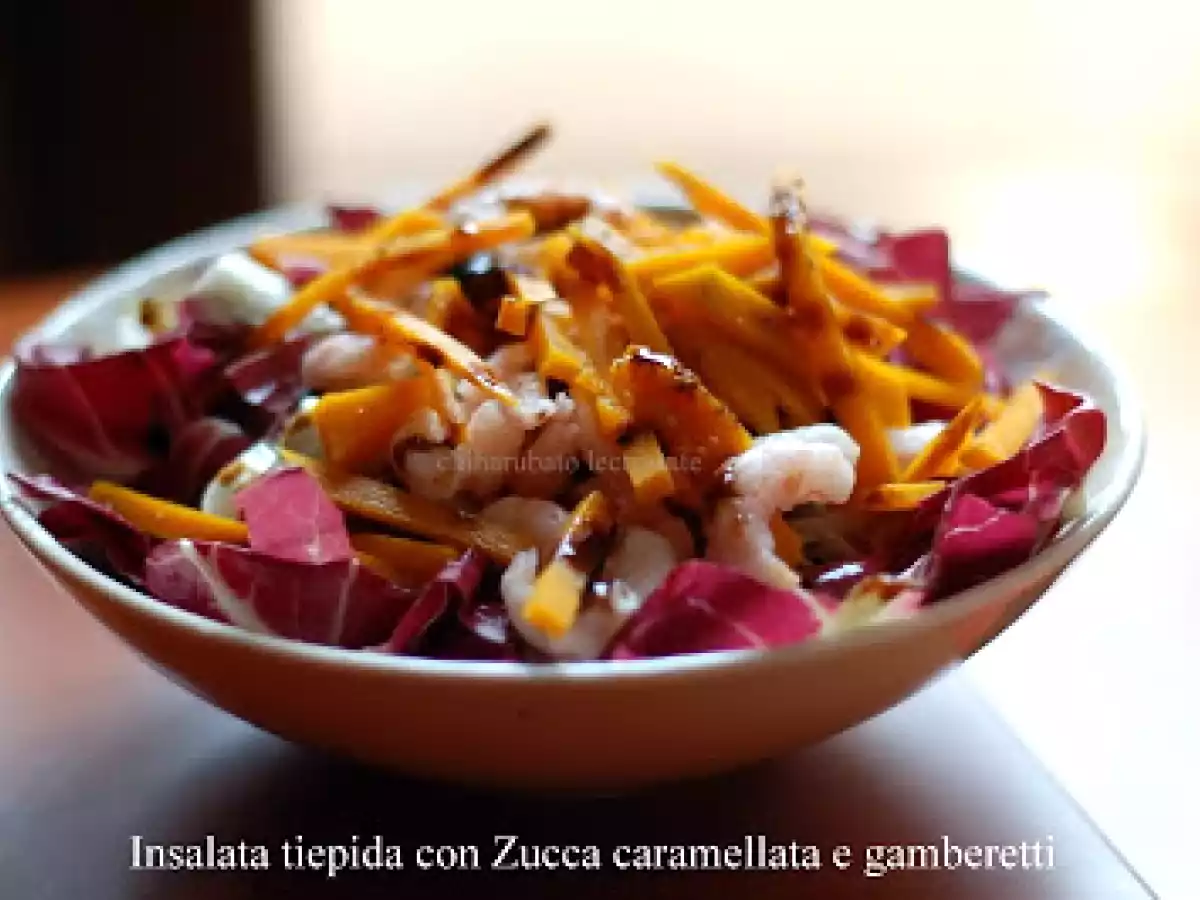 Insalata tiepida con zucca caramellata e gamberetti