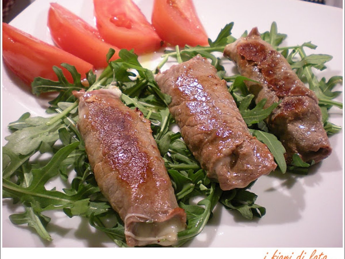 Involtini di carpaccio rucola e scamorza Antipastofacile20 min Invia questa ricetta ad un amico Stampa la ricetta Contatta l'autore della Ricetta Pubblica la foto di questa ricetta Ingredienti 4 300 gr di carpaccio di manzo Rucola a piacere 100-150 g Scamorza affumicata in fette sottili Insaporitore per carni Ariosto Olio extravergine di oliva