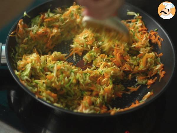 Ora grattugiate la zucchina e le carote. Poi saltatele in padella con l'olio d'oliva per circa 5 minuti.