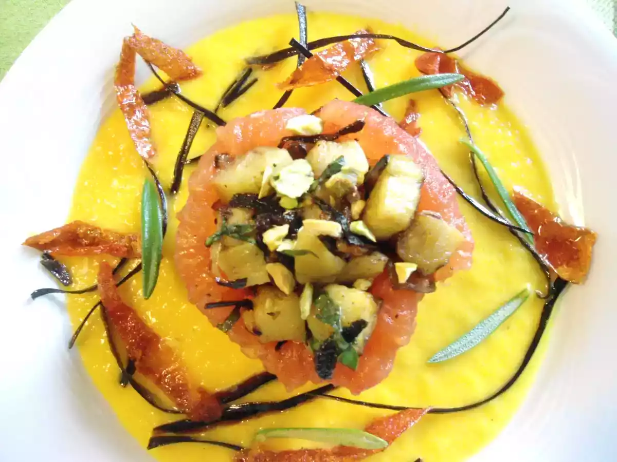 Al centro posizionare il pomodoro riempito con uno o due cucchiai di melanzana. Cospargere di pistacchi tritati. - Decorare la crema di peperoni con le bucce e le foglie fritte e qualche ago di rosmarino semplicemente lavato.