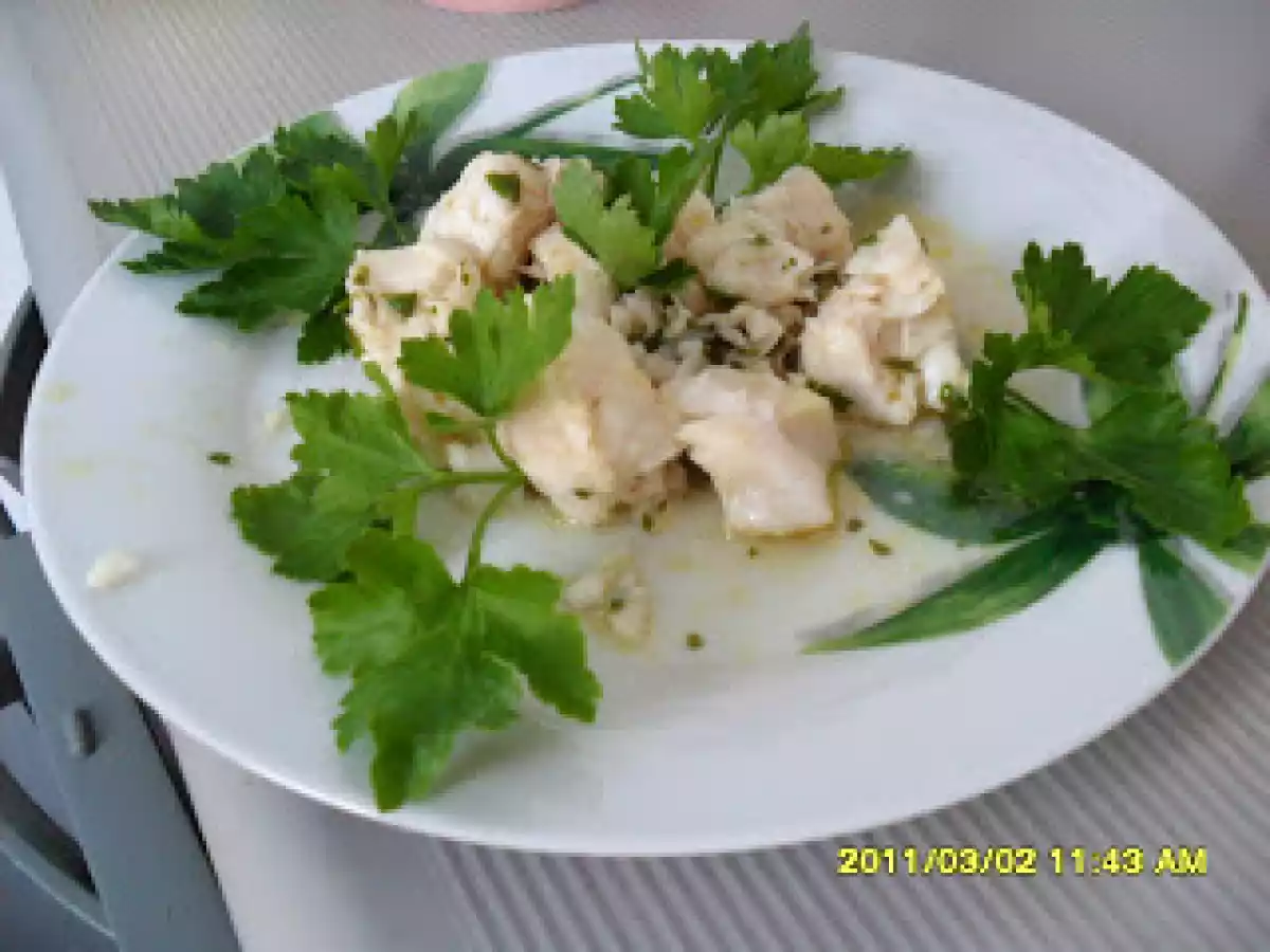 Merluzzo al verde Antipastofacile25 min268 Kcal Invia questa ricetta ad un amico Stampa la ricetta Contatta l'autore della Ricetta Pubblica la foto di questa ricetta Ingredienti 2 400 g di merluzzo pulito e tagliato a pezzi 1 spicchio d'aglio prezzemolo a piacere succo di un limone olio extra vergine di oliva sale Costo stimato: 6.06Euros€ (3.03€/Porzioni)