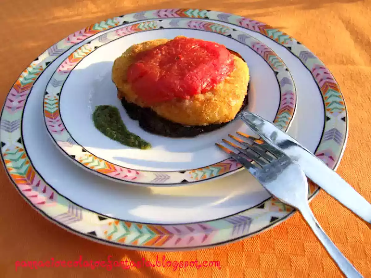 Millefoglie di melanzane, con mozzarella di bufala, pomodoro e pesto Antipastofacile25 min Invia questa ricetta ad un amico Stampa la ricetta Contatta l'autore della Ricetta Pubblica la foto di questa ricetta Ingredienti 4 2 melanzane grandi 2 pomodori grandi 2 mozzarelle di bufala da 250g 2 uova 2 acciughe sott'olio 100 g di pangrattato 50 g di pesto fresco olio per friggere olio extravergine di oliva sale e pepe