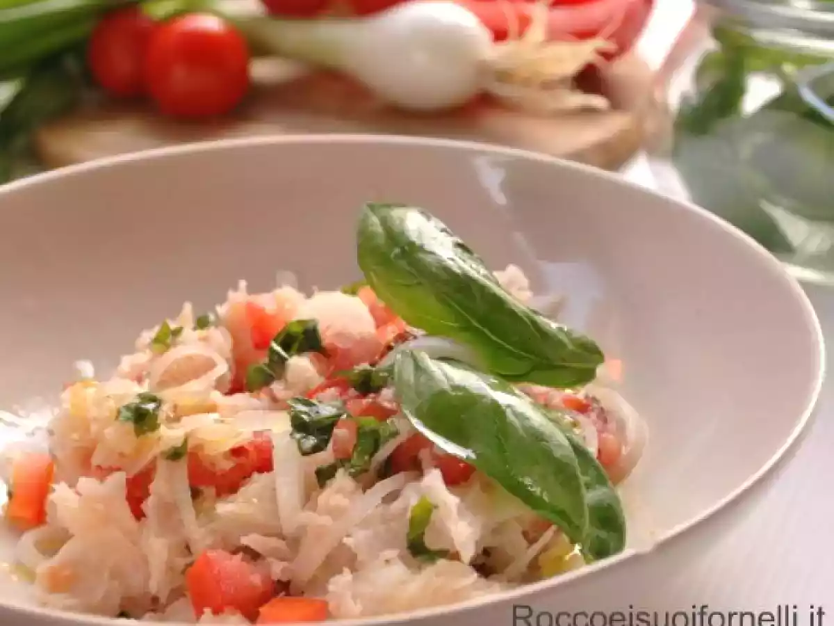 - Insaporire il pomodoro tagliato a pezzi con olio, aceto, basilico tritato, sale e pepe.