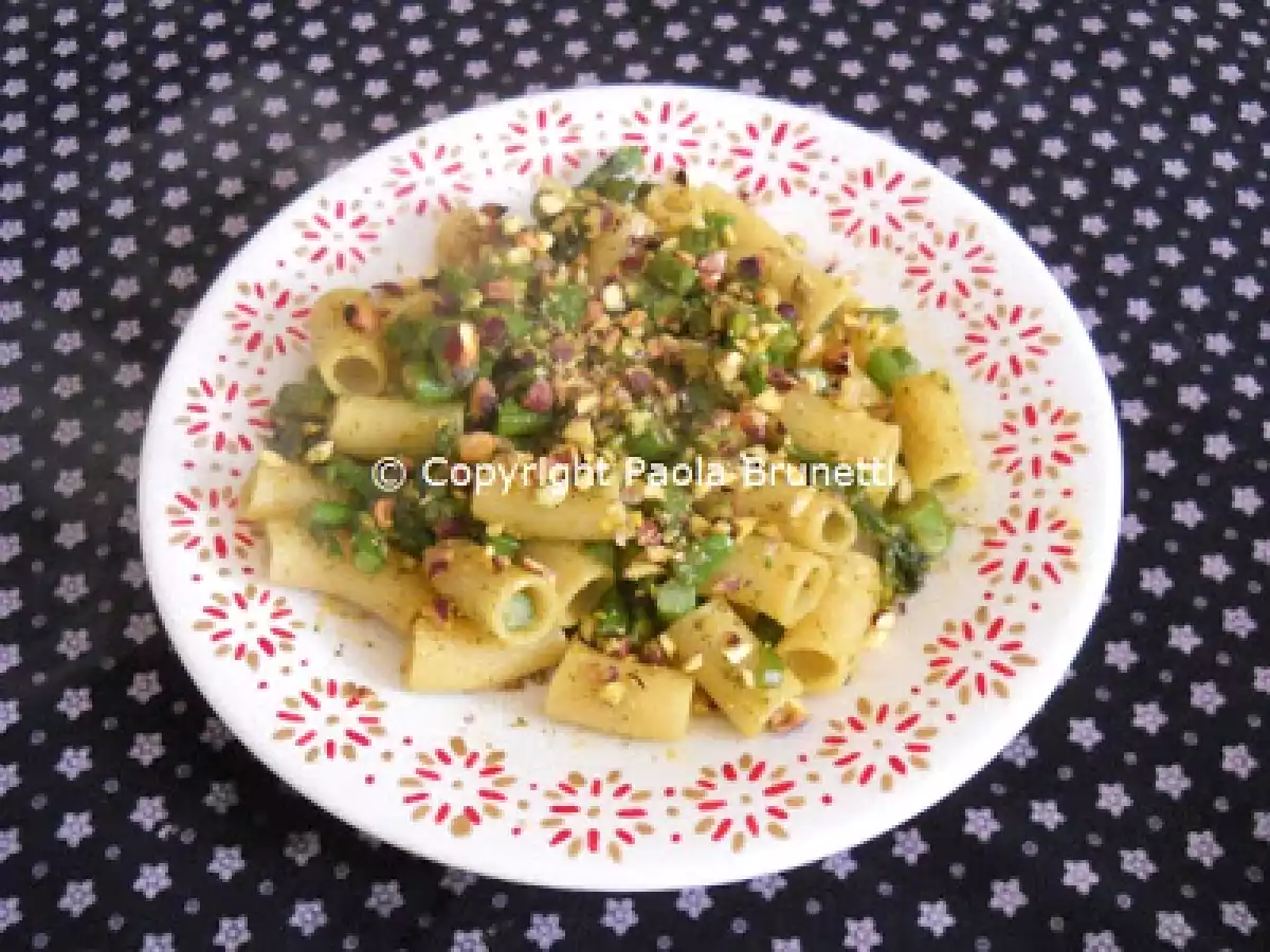 Pasta millerighe con asparagi e pistacchi vota adesso Antipastomedia25 min483 Kcal Invia questa ricetta ad un amico Stampa la ricetta Contatta l'autore della Ricetta Pubblica la foto di questa ricetta Ingredienti 4 360 g pasta formato millerighe 30 g burro 300 g asparagi freschissimi un poco di prezzemolo 50 g pistacchi tostati 1 tuorlo sale, pepe