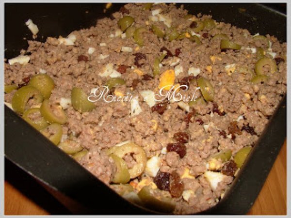 A questo punto aggiungete le olive, le uova sode tritate e le uvette. - Sistemare la carne in una teglia dai bordi alti per forno.