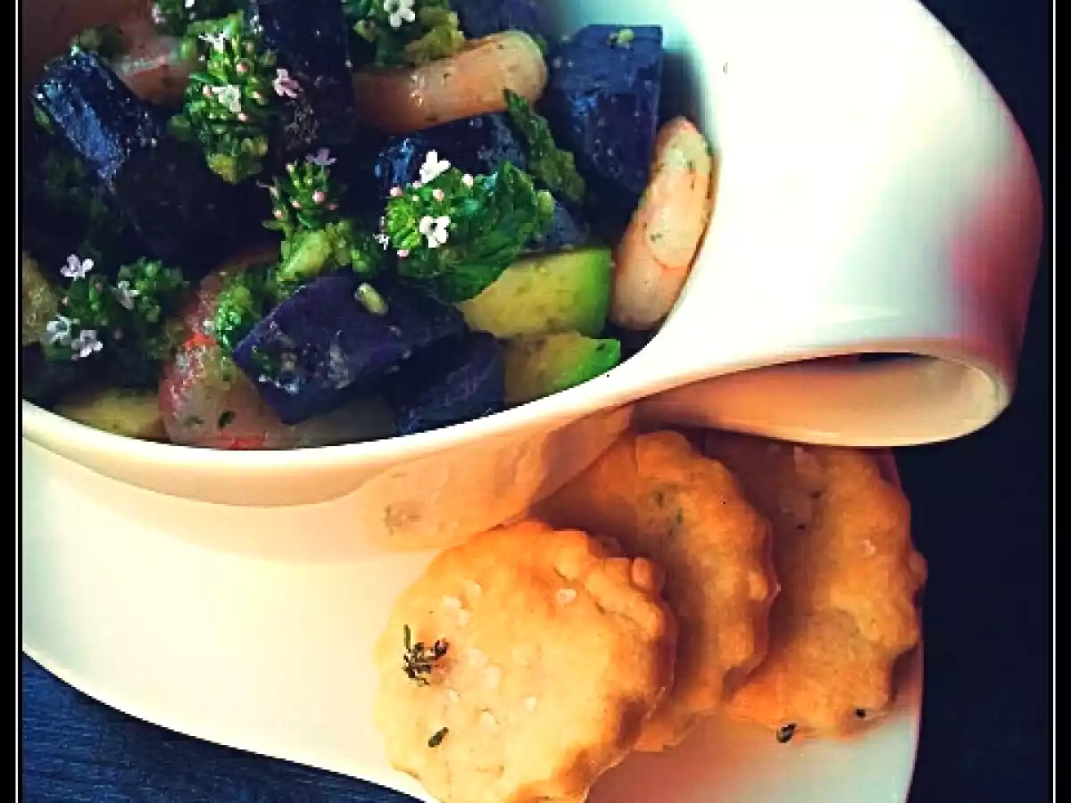 Patate viola, avocado e mazzancolle con pesto aromatico e crackers al timo