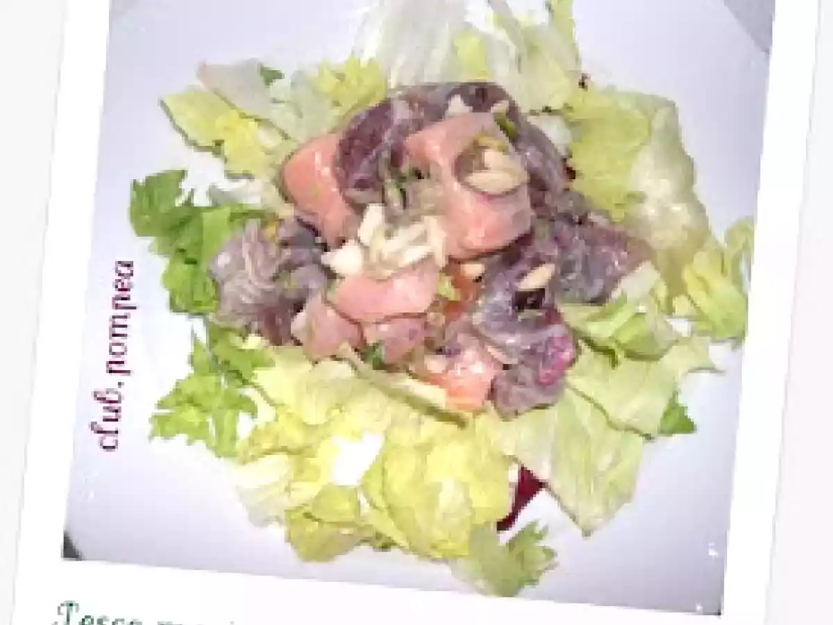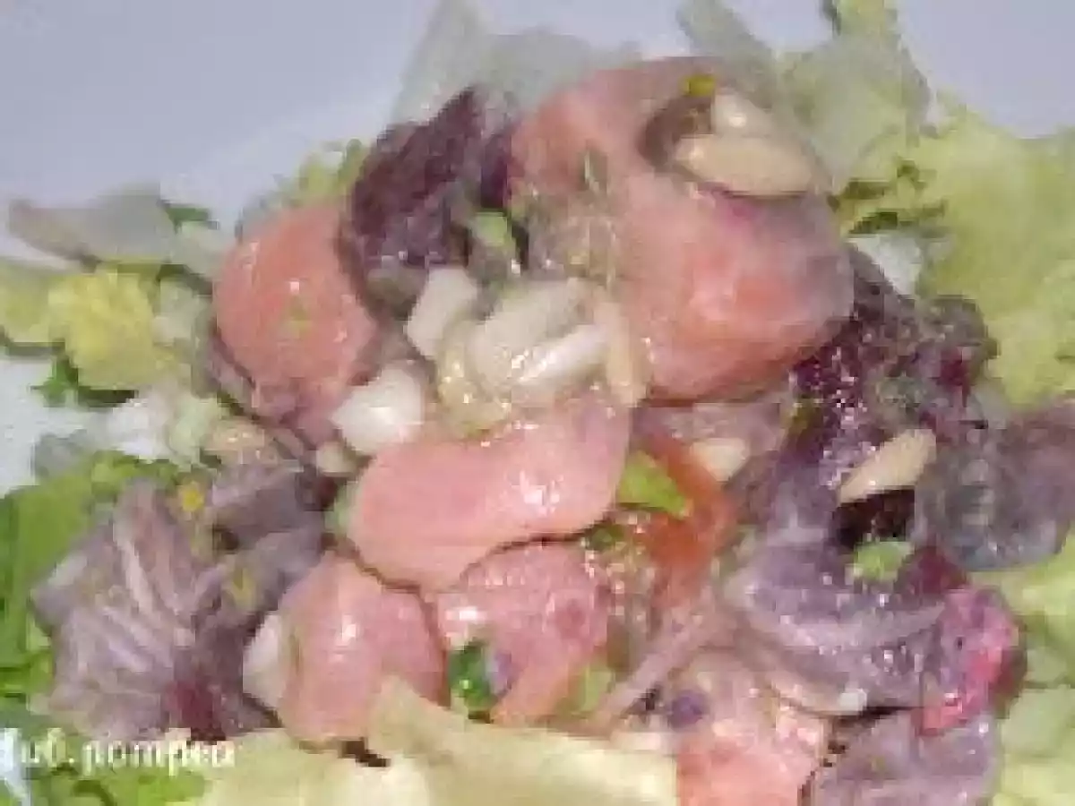 Pesce agli aromi mediterranei PrecedenteProssimo Antipastofacile35 min494 Kcal Invia questa ricetta ad un amico Stampa la ricetta Contatta l'autore della Ricetta Pubblica la foto di questa ricetta Ingredienti 3 350 g salmone fresco 350 g di tonno fresco capperi pinoli pistacchi di Bronte foglioline di timo 1-2 spicchi d'aglio 1 limone sale pepe misto olio insalata fresca Costo stimato: 15.76Euros€ (5.25€/Porzioni)